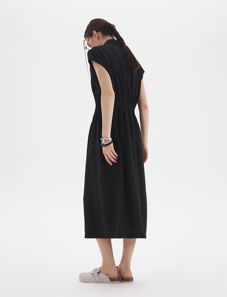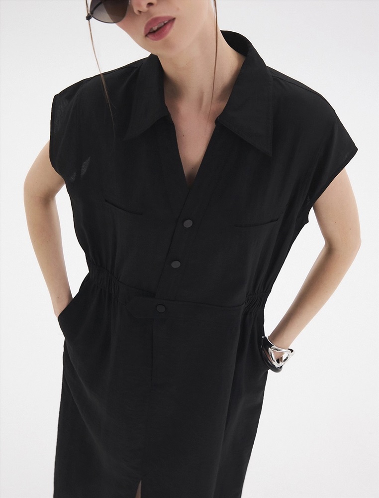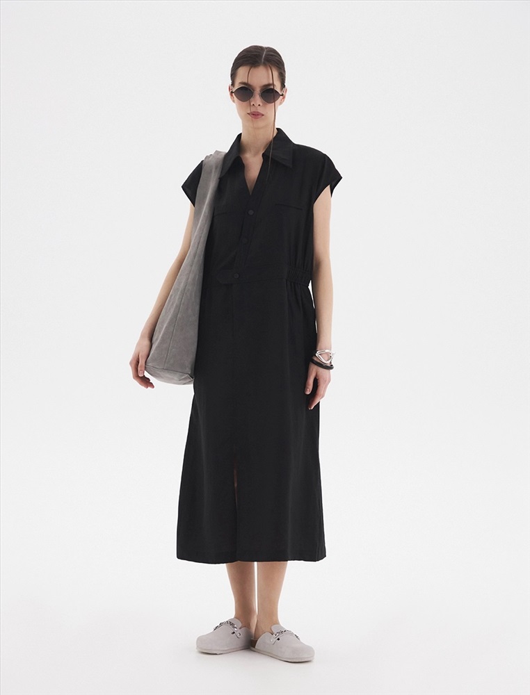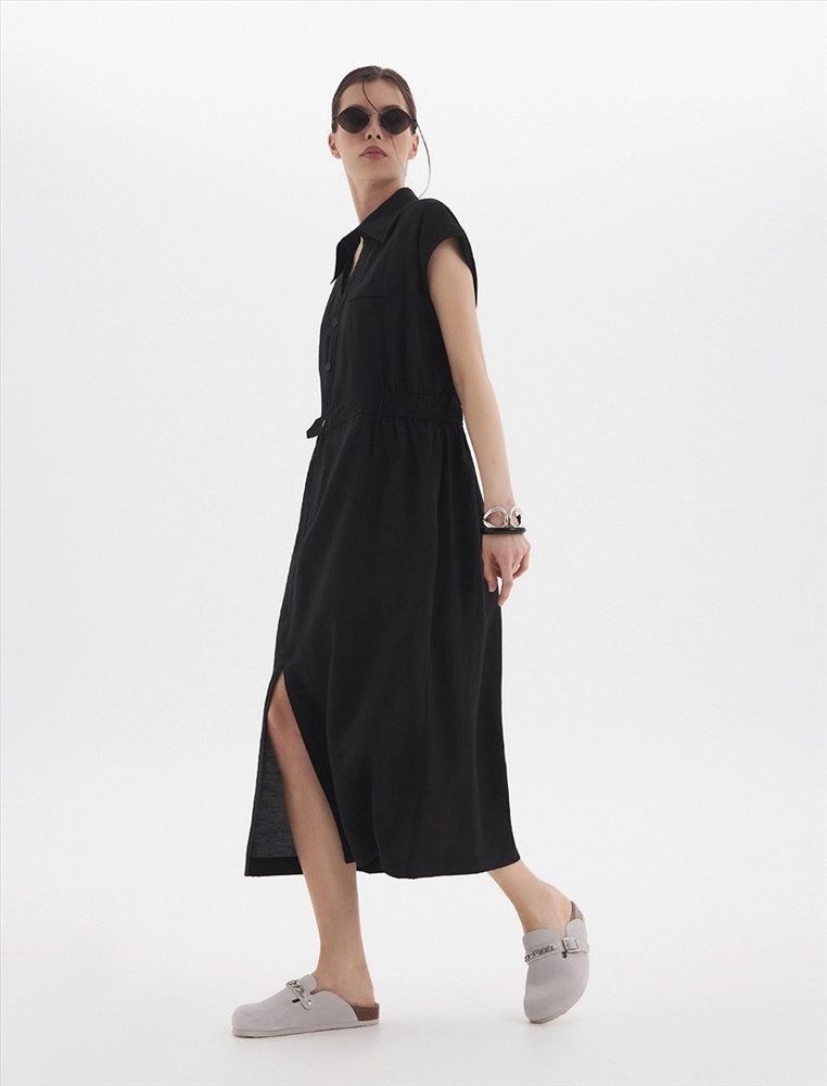 Видео: https-//hassfashion.ru/upload/iblock/6d9/8ocn82i3vrloljel5z584wmtrzqk12lh.mp4 весна-лето 33% Тенсел, 33% Нейлон, 26% Район, 8% Лен Платье-рубашка приталенного силуэта с отложным воротником и короткими рукавами. По талии расположена резинка. По передней части изделия V-образная горловина, уходящая в застежку на кнопки, а также два нагрудных кармана. Комментарии к товару