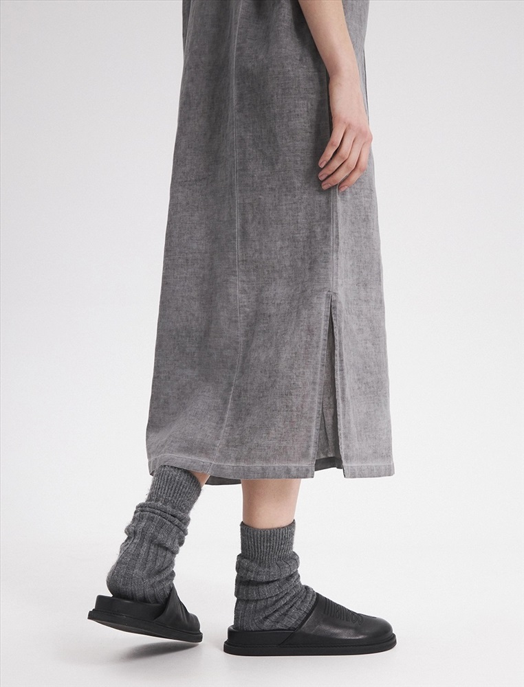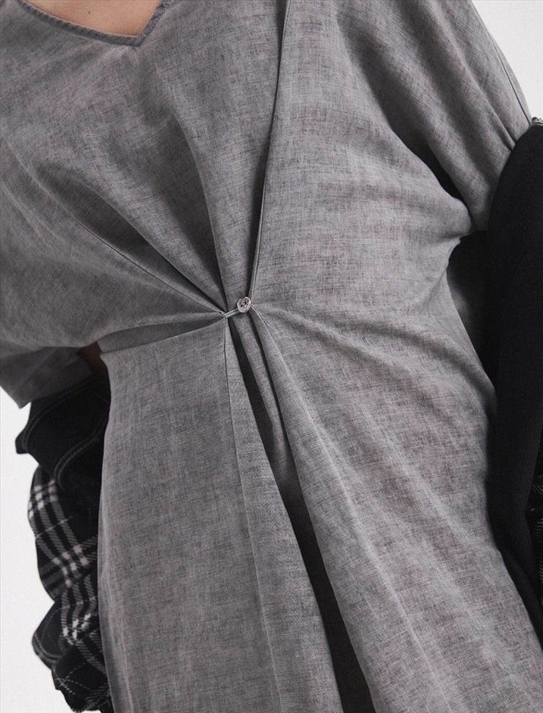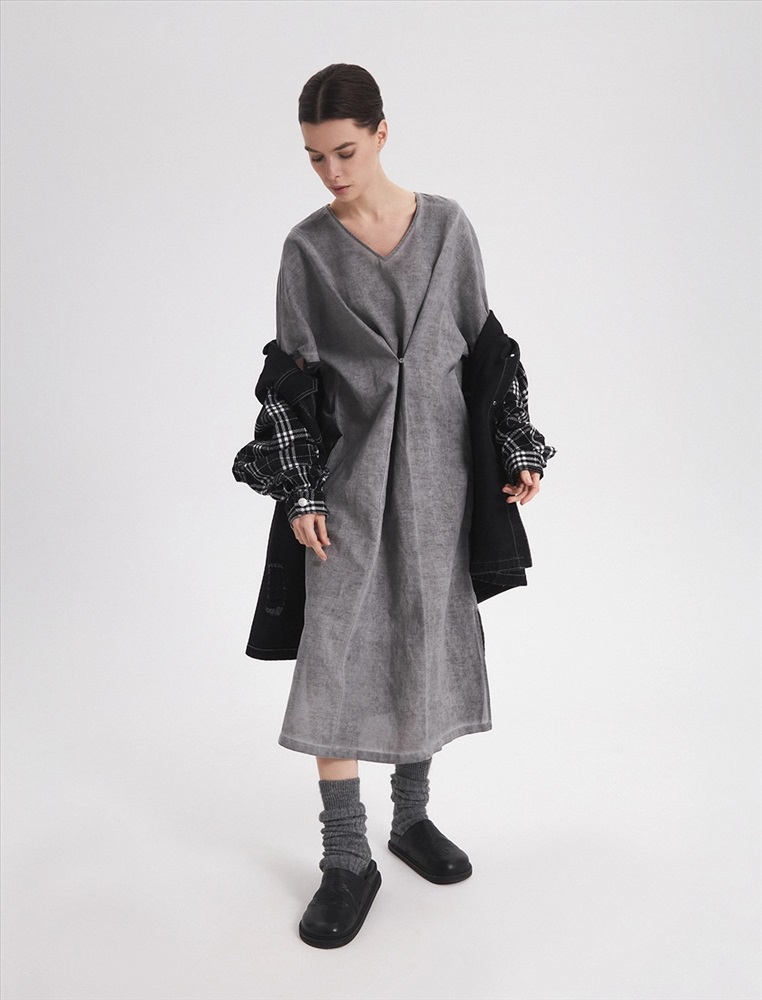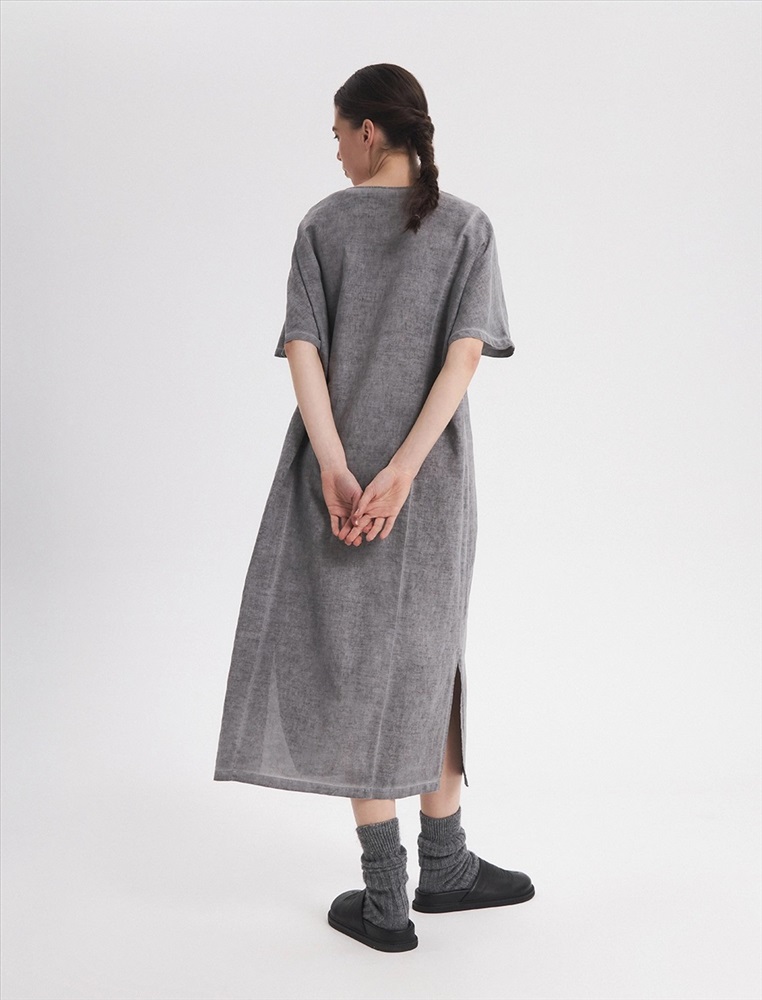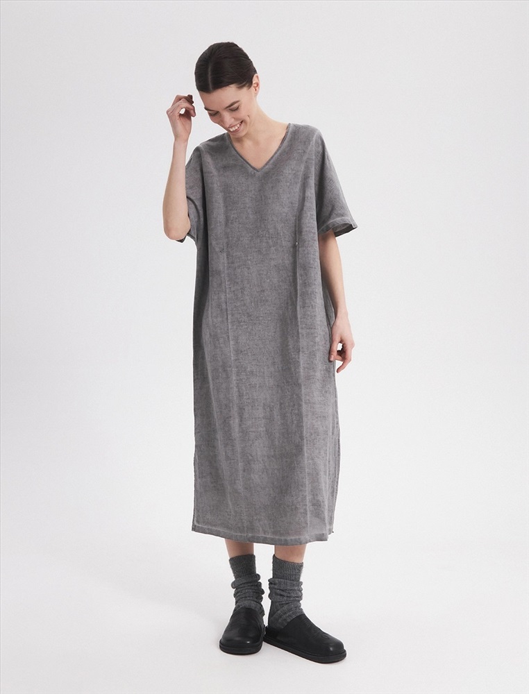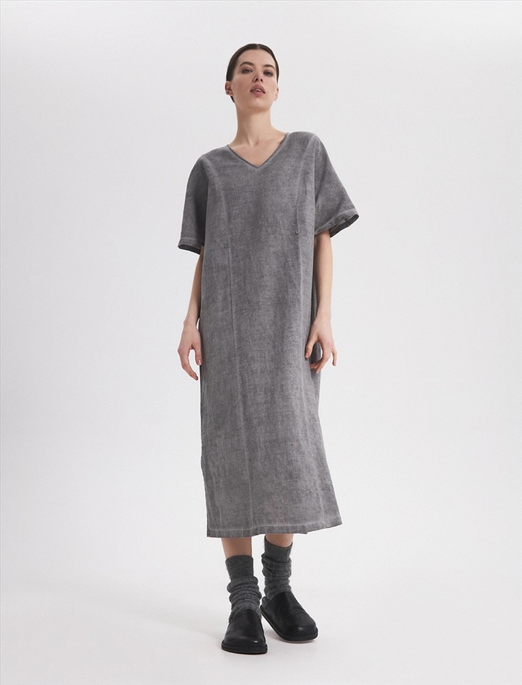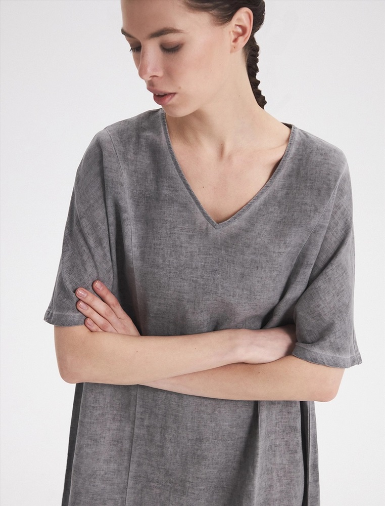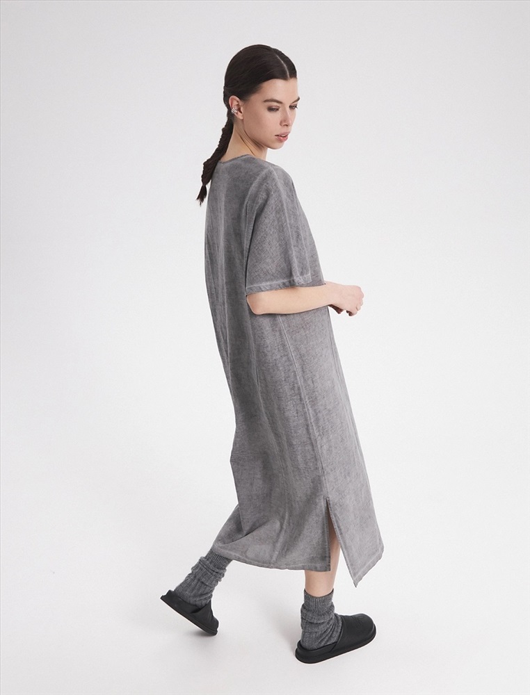 Платье-футболка прямого силуэта, с V-образной горловиной. Спереди, на уровне ниже груди петля с пуговицей, при застегивали которых силуэт платья становится более приталенным. По нижней части изделия по бокам разрезы.