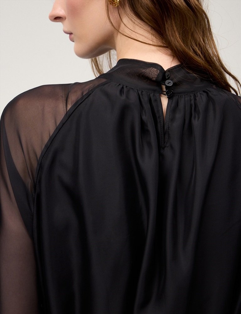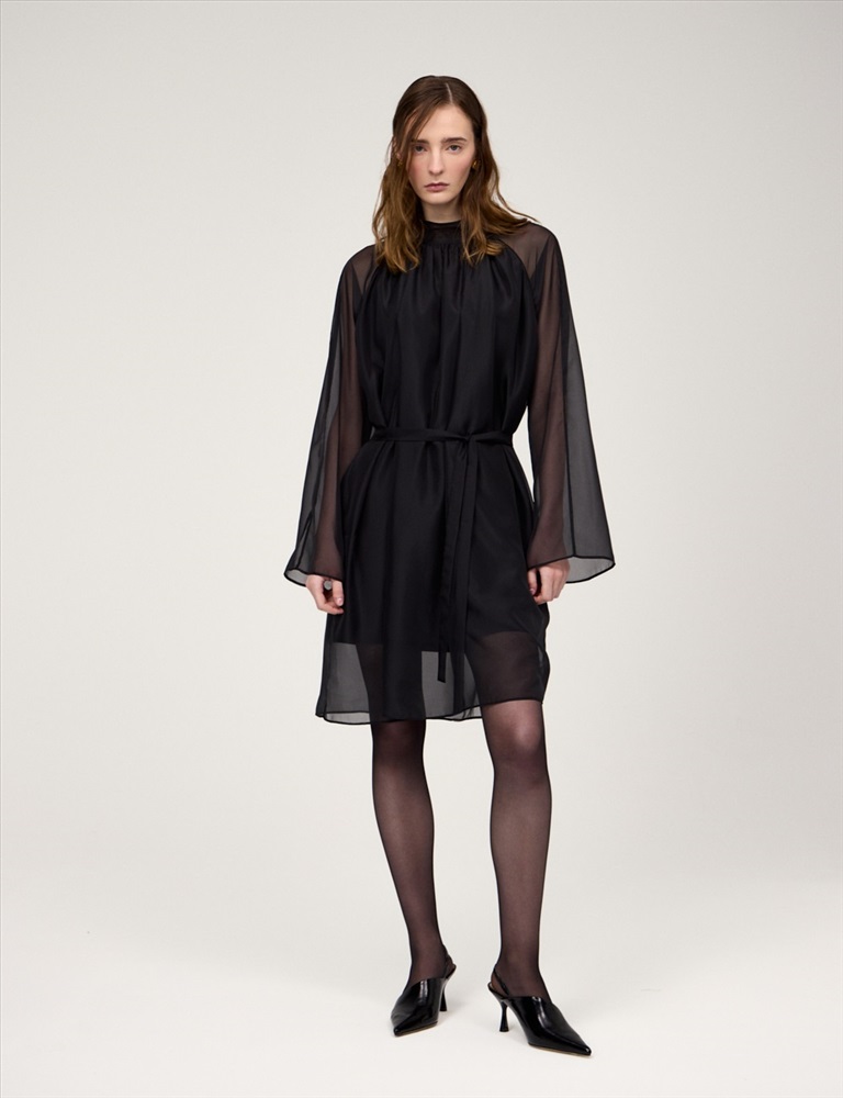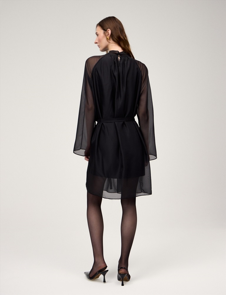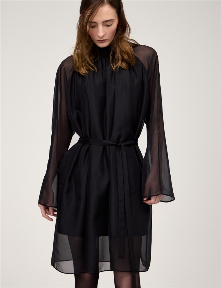 Платье свободного силуэта с воротником-стойкой и рукавом по типу реглан. Длина до уровня колена. Складки внизу воротника и по пройме рукавов создают объемную сборку. На спинке по воротнику застежка на пуговицы и разрез. Ткань верха выполнена из вискозы (71%), нейлона и шелка, что создает эффект прозрачности, а подкладочная ткань из вискозы (78%) и нейлона. Представлено в черном оттенке. В комплекте пояс из ткани верха.