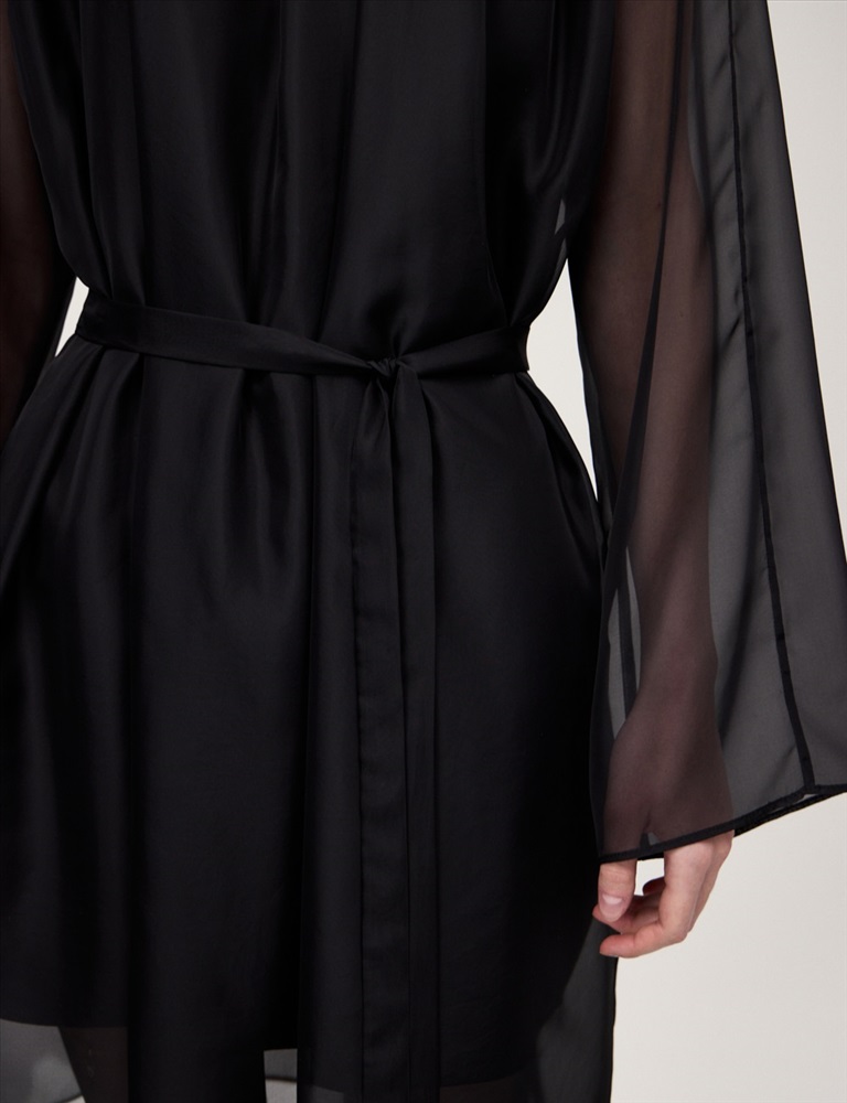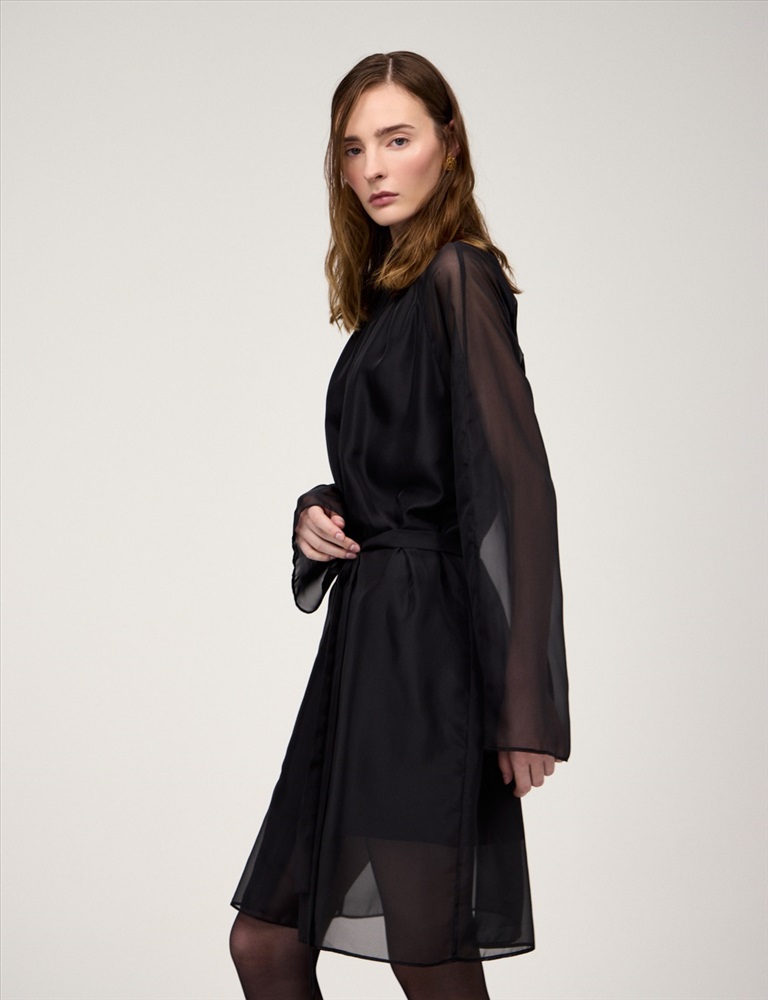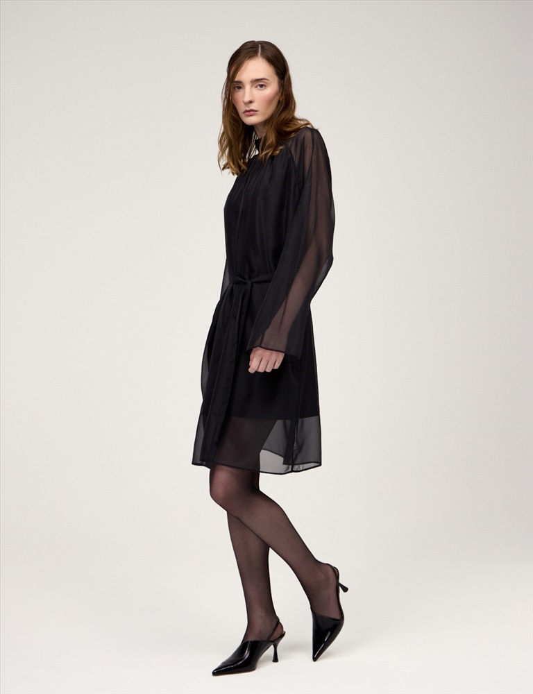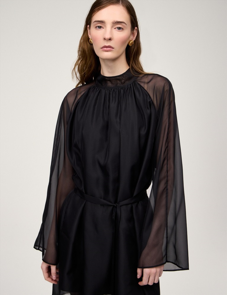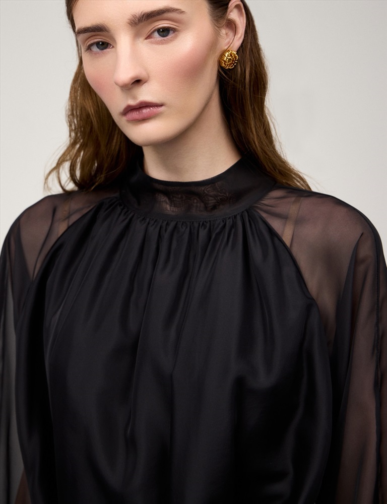 Платье свободного силуэта с воротником-стойкой и рукавом по типу реглан. Длина до уровня колена. Складки внизу воротника и по пройме рукавов создают объемную сборку. На спинке по воротнику застежка на пуговицы и разрез. Ткань верха выполнена из вискозы (71%), нейлона и шелка, что создает эффект прозрачности, а подкладочная ткань из вискозы (78%) и нейлона. Представлено в черном оттенке. В комплекте пояс из ткани верха.