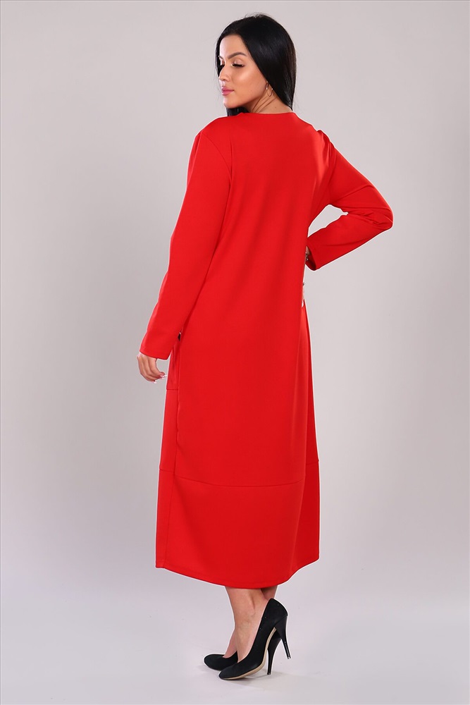 Страна производства: Россия Изящное женское платье свободного кроя. Фигурная горловина отделана декоративной молнией. Длинный рукав. Интересный накладной карман с декоративными молнией и пуговицами. Низ изделия отрезной. Платье ниже колен.
