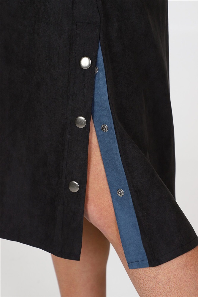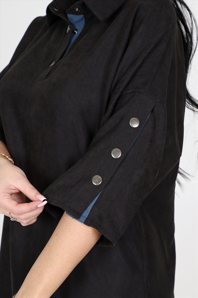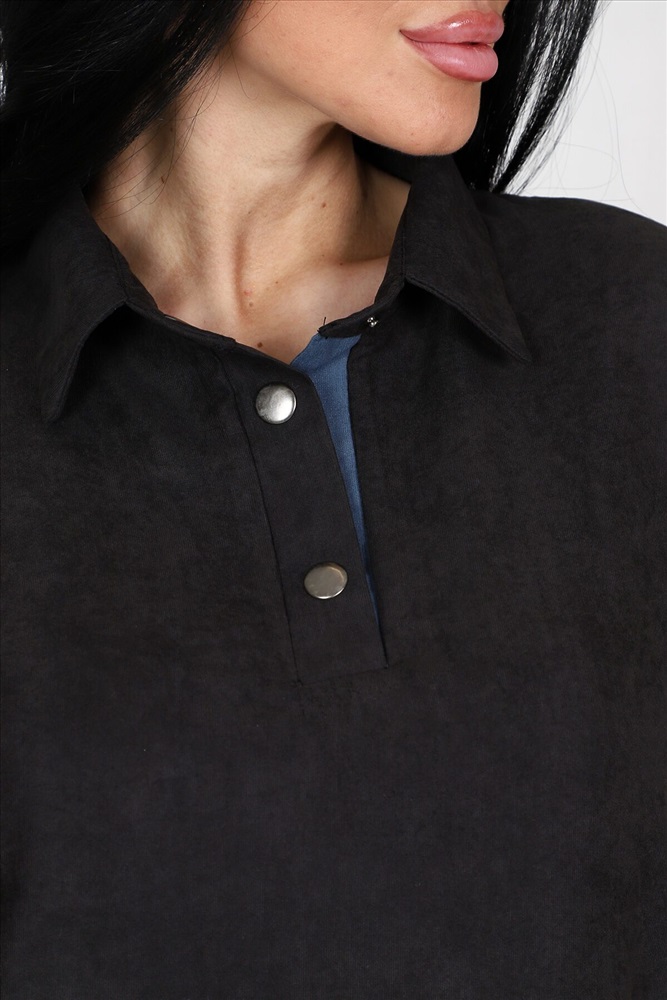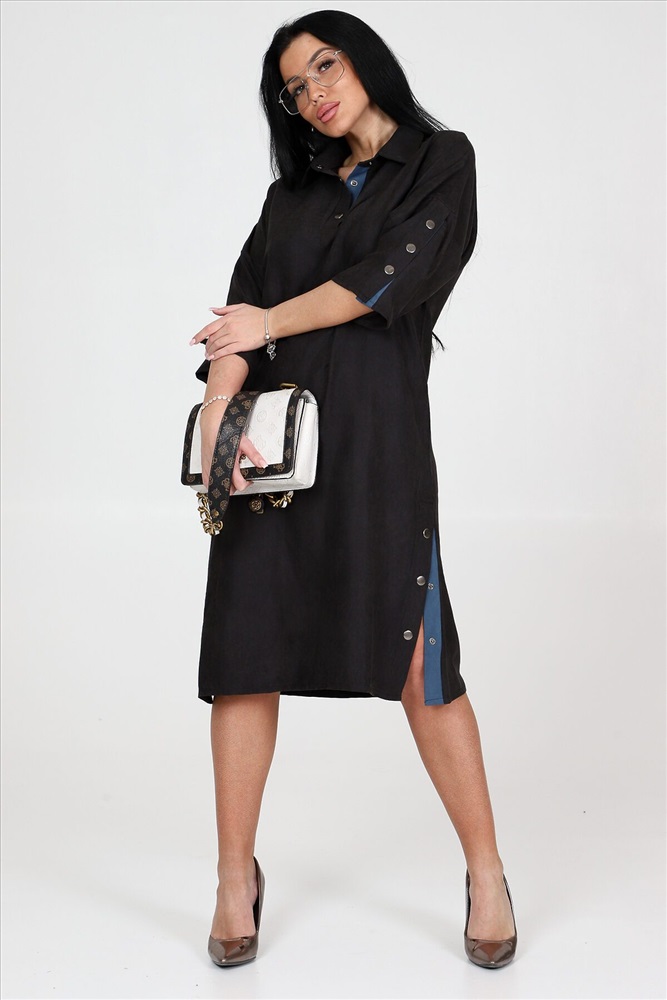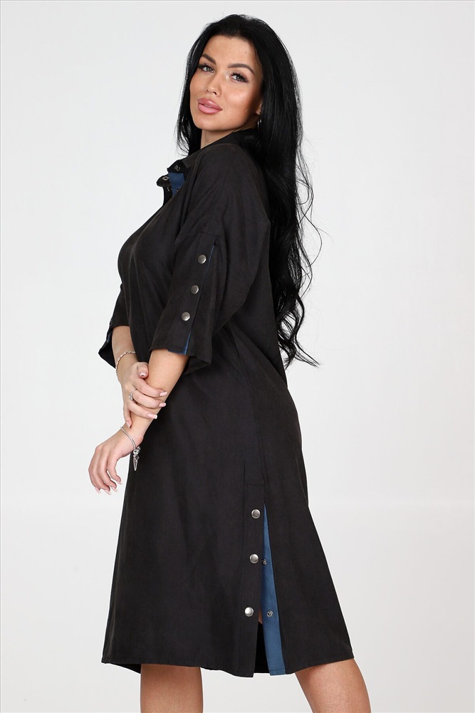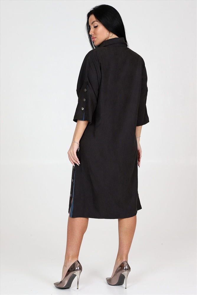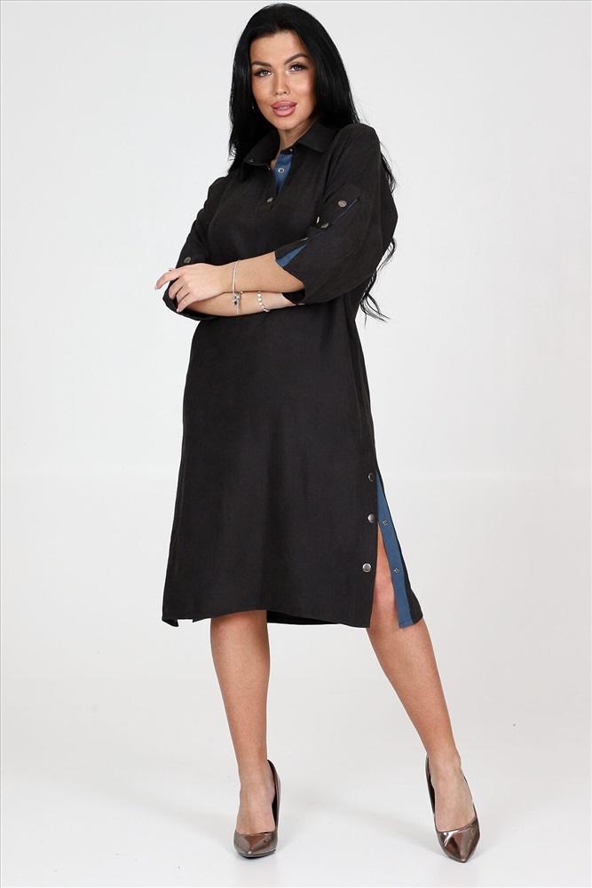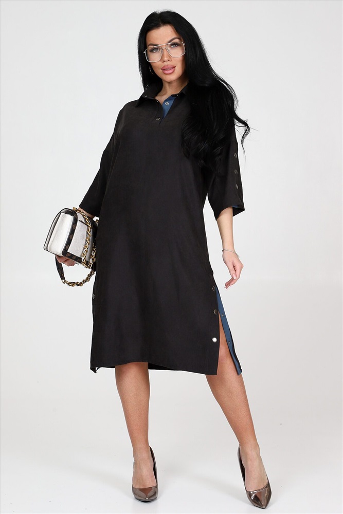 ID товара: 961119 Состав: 62% Полиэстер; 34% Вискоза; 4% Эластан Сезон: Демисезон Длина: Ниже колена Фасон: Свободный крой Рукав: 3/4 Вырез горловины: Отложной воротничок Декоративные элементы: Кнопки Основная ткань: Полиэстер Стиль: повседневный Вид ткани: Микровельвет Страна бренда: Россия Страна производства: Россия Женское платье силуэта летучая мышь идеальный выбор для стильных и модных девушек. Это платье обладает уникальными чертами: рукава три четверти с оригинальным разрезом на кнопках, рубашечный воротник и полочка, украшенная планкой на кнопках. А еще, платье имеет разрезы по бокам, также украшенные кнопками. Платье выполнено из качественной ткани микровельвет, состоящей из 62% полиэстера, 34% вискозы и 4% эластана. Это обеспечивает комфорт и хорошую посадку платья на фигуру. Оно идеально подчеркнет достоинства вашей фигуры и создаст невероятно женственный образ. Платье представлено в двух расцветках: черной и джинсовой. Хотите выглядеть элегантно в классической черной, или отдаете предпочтение смелому и стильному образу в джинсовом тоне на любой случай, вам есть из чего выбрать. Размерный ряд этого платья включает в себя размеры с 50 по 60, чтобы каждая модница могла найти идеально сидящий вариант для своей фигуры. Однотонность платья с вставками добавит места для экспериментов с аксессуарами и создания интересных образов под настроение или событие. Комментарии к товару