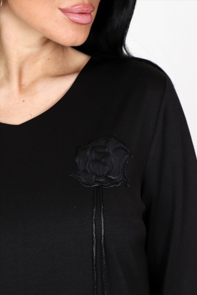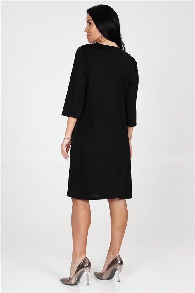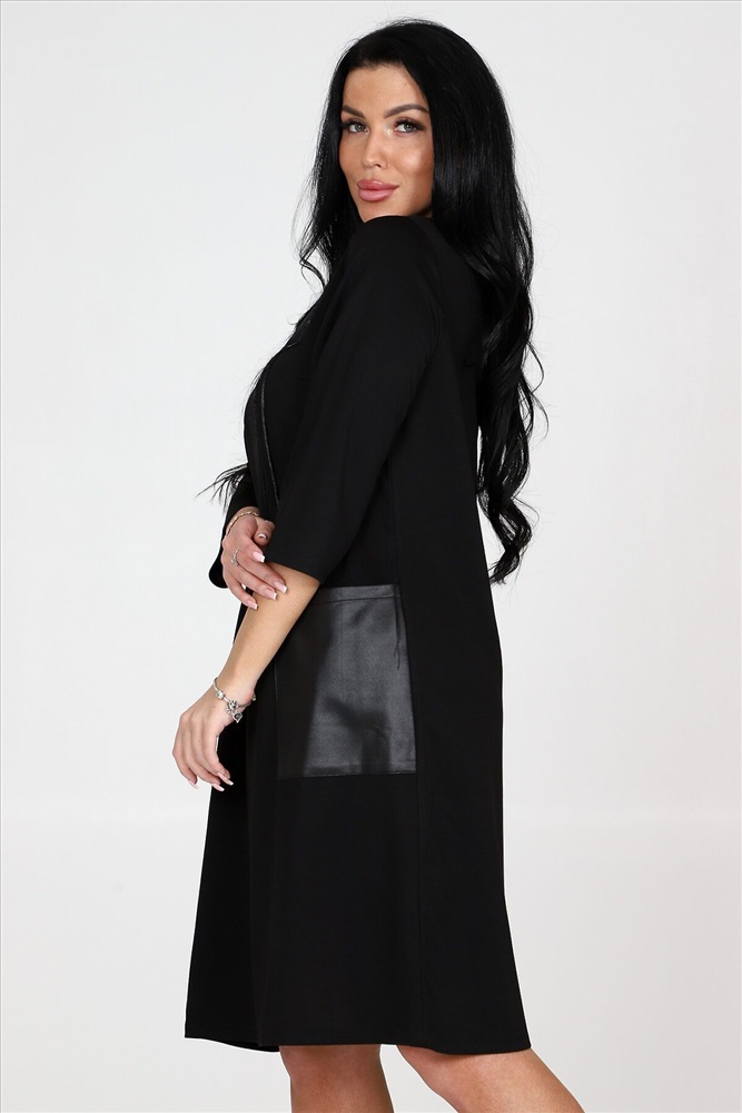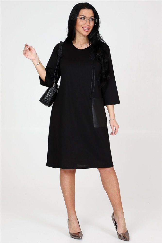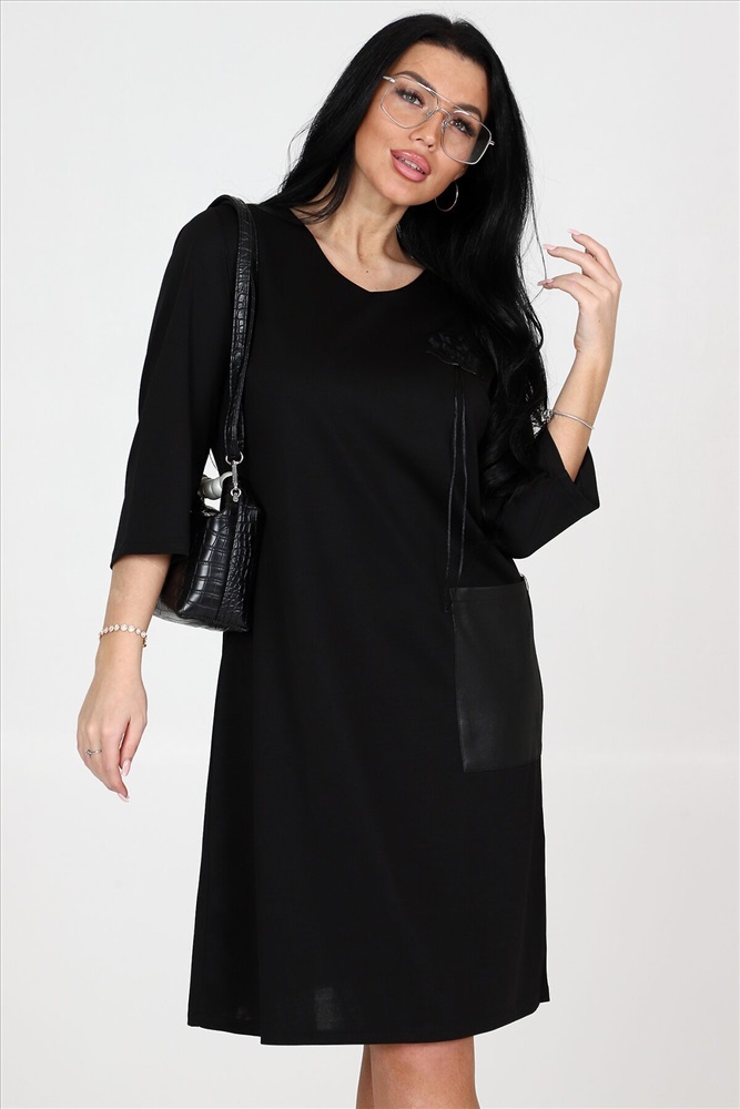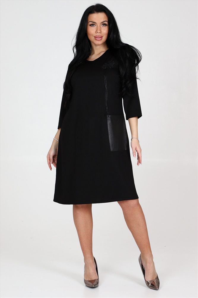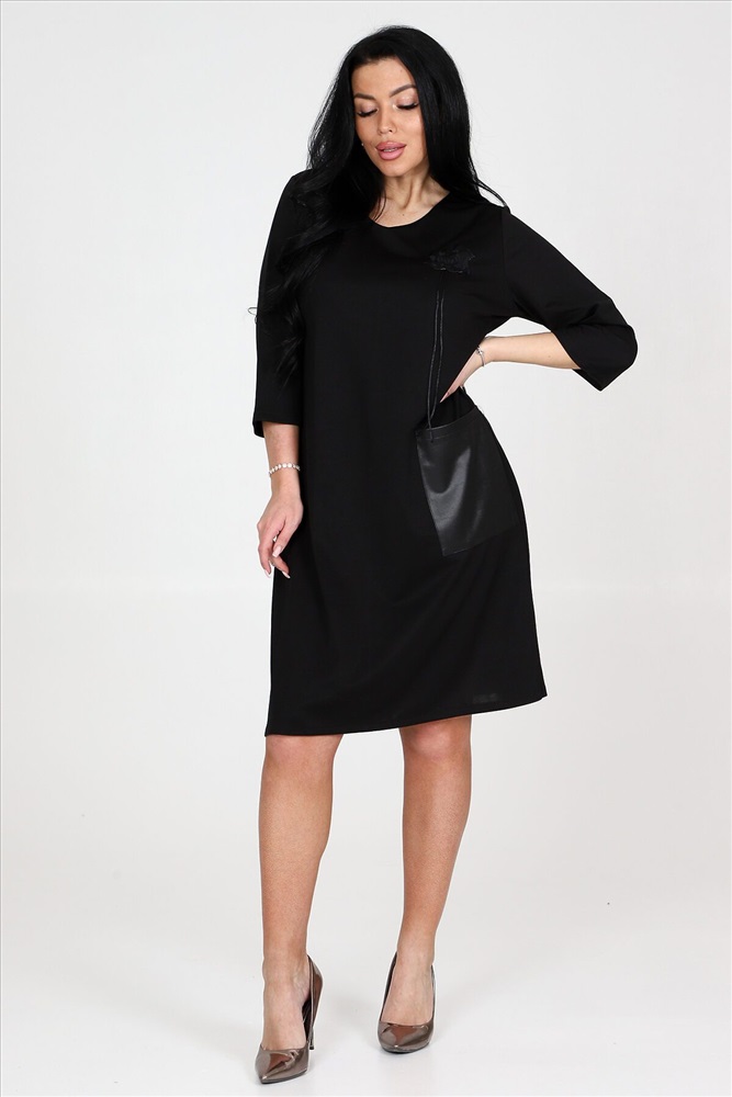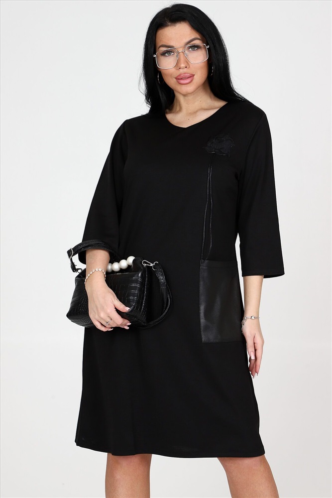 Платье имеет округлый вырез и удобный рукав 3/4, что делает его идеальным выбором для любого времени года. Но что делает его по-настоящему особенным - это накладной карман, искусственно имитирующий эко-кожу. Этот элемент придает платью современный и модный вид, привлекая внимание окружающих. Однако наша оригинальная аппликация в виде розы на груди является настоящей изюминкой этого платья. Она добавляет нежности и романтичности вашему образу, делая его более женственным. Это средней длины платье выполнено из ткани водолаз, состоящей из 95% полиэстера и 5% спандекса. Такой материал обеспечивает комфорт и отличную посадку, а также позволяет платью сохранять свою форму даже после многих стирок.