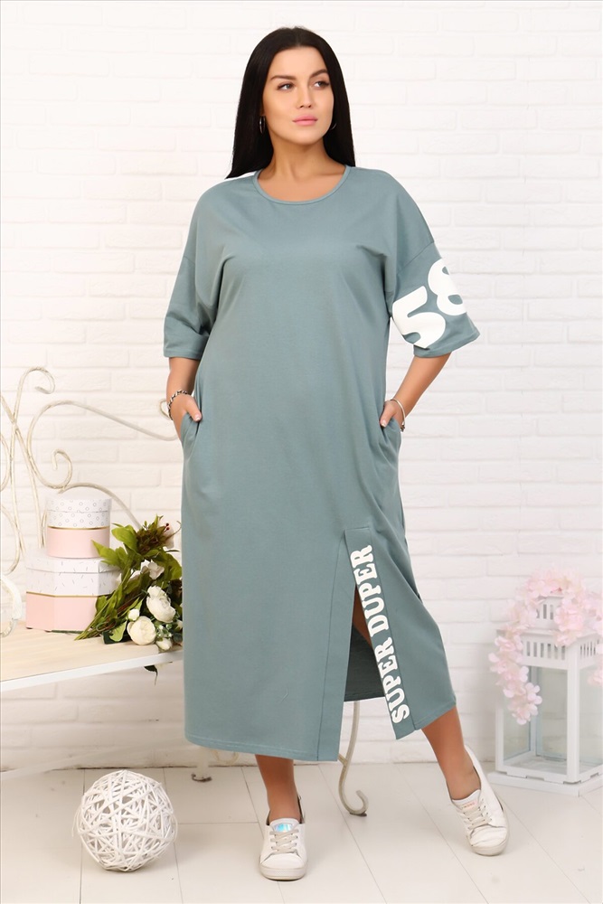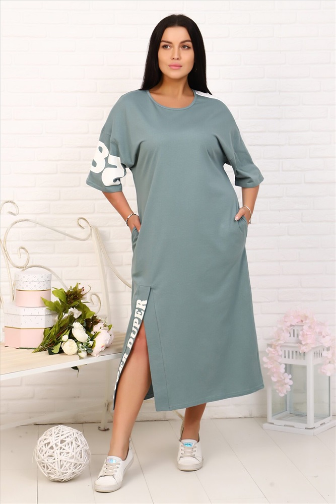 Платье женское сшито из качественного трикотажного полотна, в стиле оверсайз. Горловина округлой формы, обработана бейкой, рукава платья спущены. На рукаве и на планке внизу печать. На плече отделочная полоса. Снизу выполнен разрез.