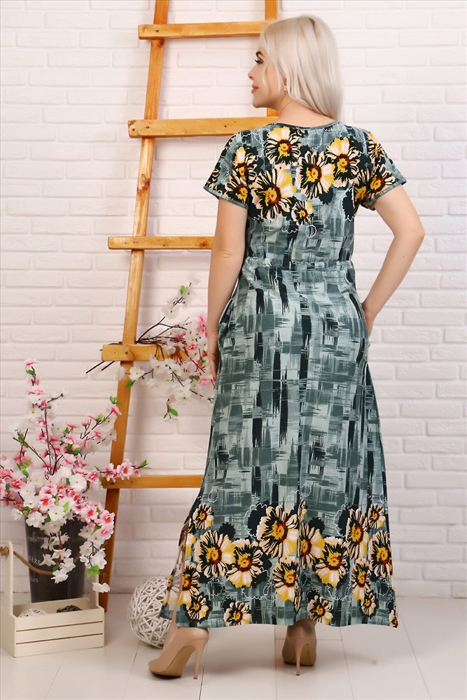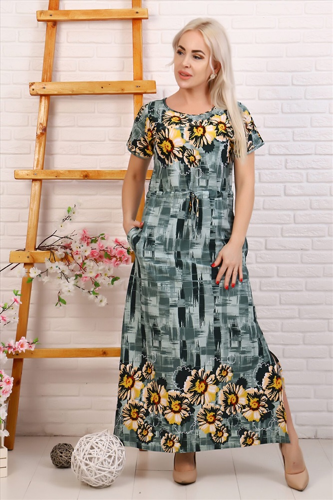 Платье женское свободного покроя, длиной до щиколоток, с разрезом снизу. Короткие спущенные рукава, отделанные бейкой. Кулиска на талии выгодно ее подчеркивает