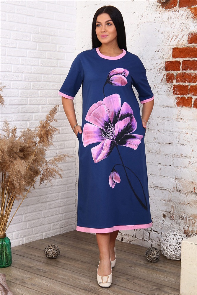 ID товара: 307100 Состав: 100% Хлопок Сезон: Весна/Лето Длина: Макси Фасон: Прямой Рукав: До локтя Вырез горловины: Круглый Рисунок: цветочный Основная ткань: Хлопок | Кулирка Стиль: Повседневный Страна бренда: Россия Страна производства: Россия Платье женское свободного покроя с короткими рукавами, длиной чуть ниже середины икр. Горловина округлой формы. По бокам карманы. На полочке красивая печать. Горловина и манжеты на рукавах и внизу выполнены из отделочной ткани. Комментарии к товару