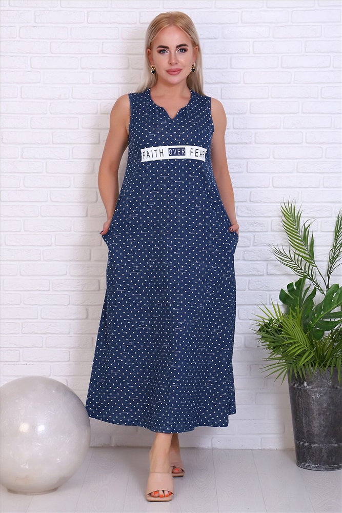 Платье женское с V-образным вырезом горловины, свободного кроя без рукавов с боковыми карманами. На груди выполнена печать. Платье гармонично смотрится как с легкими туфлями, так и удобными кроссовками. Ткань из хлопка будет создавать комфорт даже в жаркую летнюю погоду. Отлично подобранная цветовая гамма спокойных тонов освежит образ. Летнее женское платье на каждый день удобно использовать для прогулок, ланча и вечерних встреч.