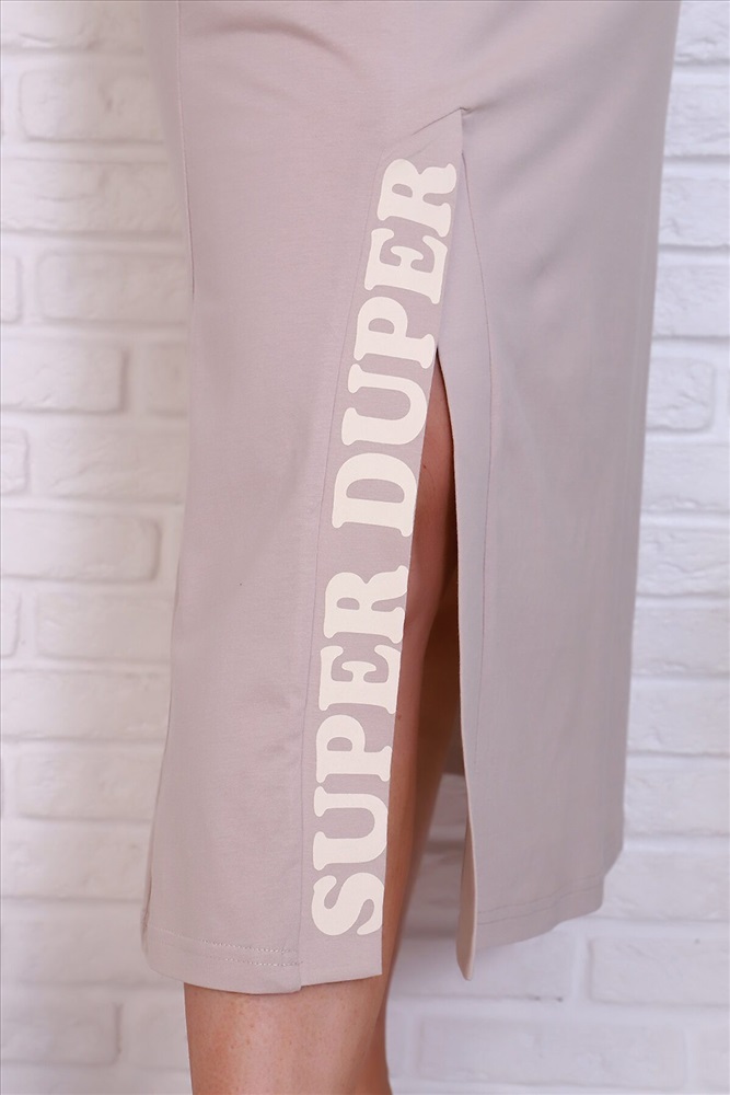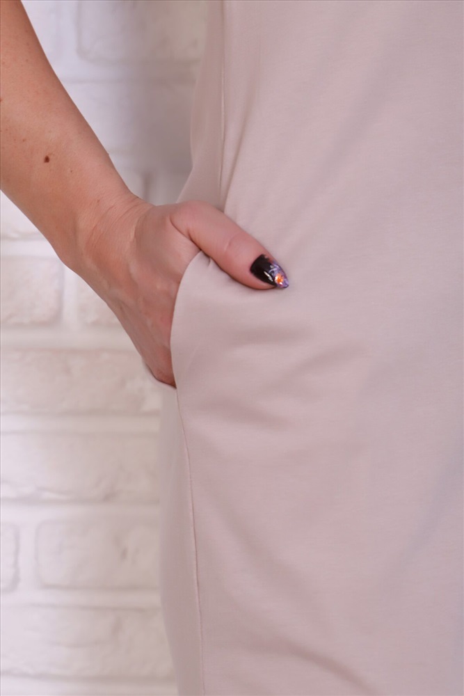 Платье молодежное прилегающего силуэта, без рукавов, с боковыми карманами. Изготовлено из натурального трикотажного полотна, 100% хлопка. Спереди разрез, дополненный принтом в виде надписи. Его можно использовать как домашнюю, повседневную одежду, а в летний период - для пляжа и морских прогулок. Платье представлено в модной цветовой гамме.
