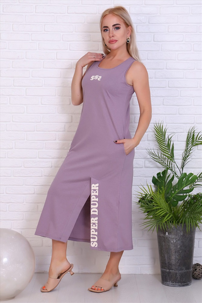 Платье молодежное прилегающего силуэта, без рукавов, с боковыми карманами. Изготовлено из натурального трикотажного полотна, 100% хлопка. Спереди разрез, дополненный принтом в виде надписи. Его можно использовать как домашнюю, повседневную одежду, а в летний период - для пляжа и морских прогулок. Платье представлено в модной цветовой гамме.