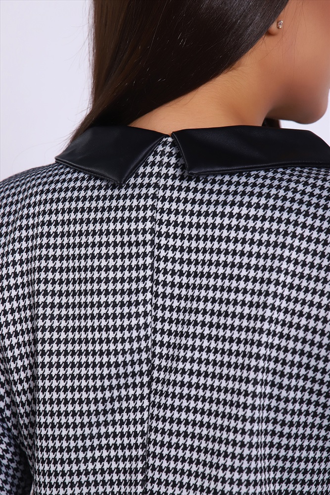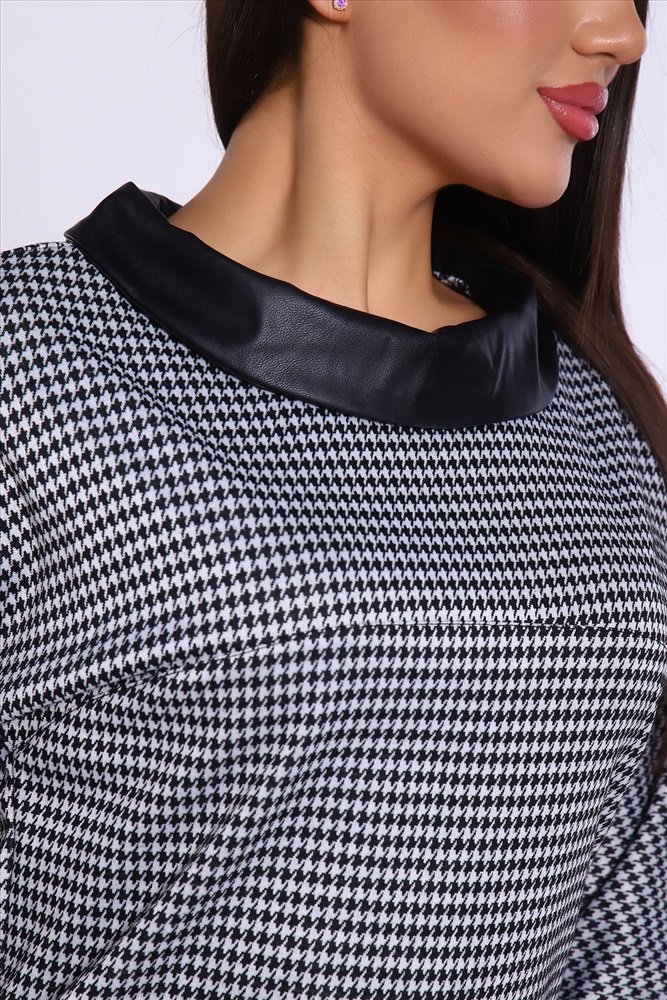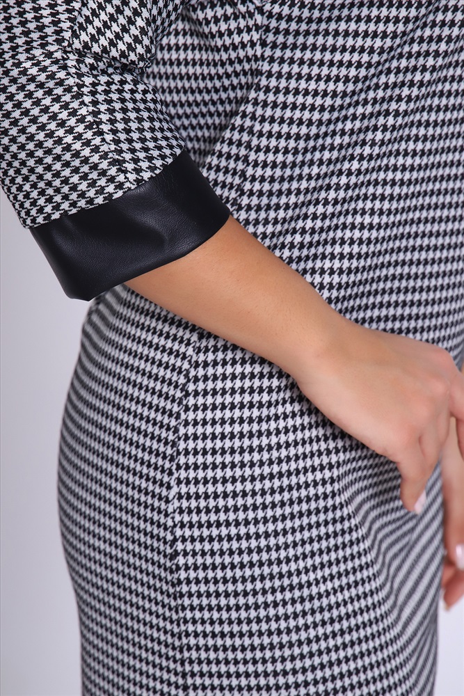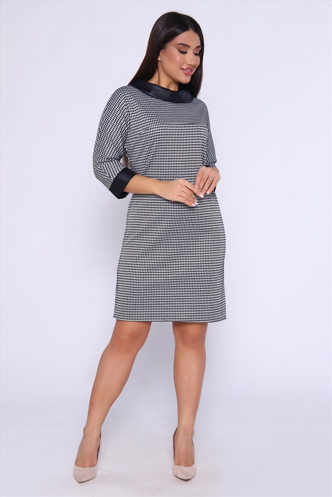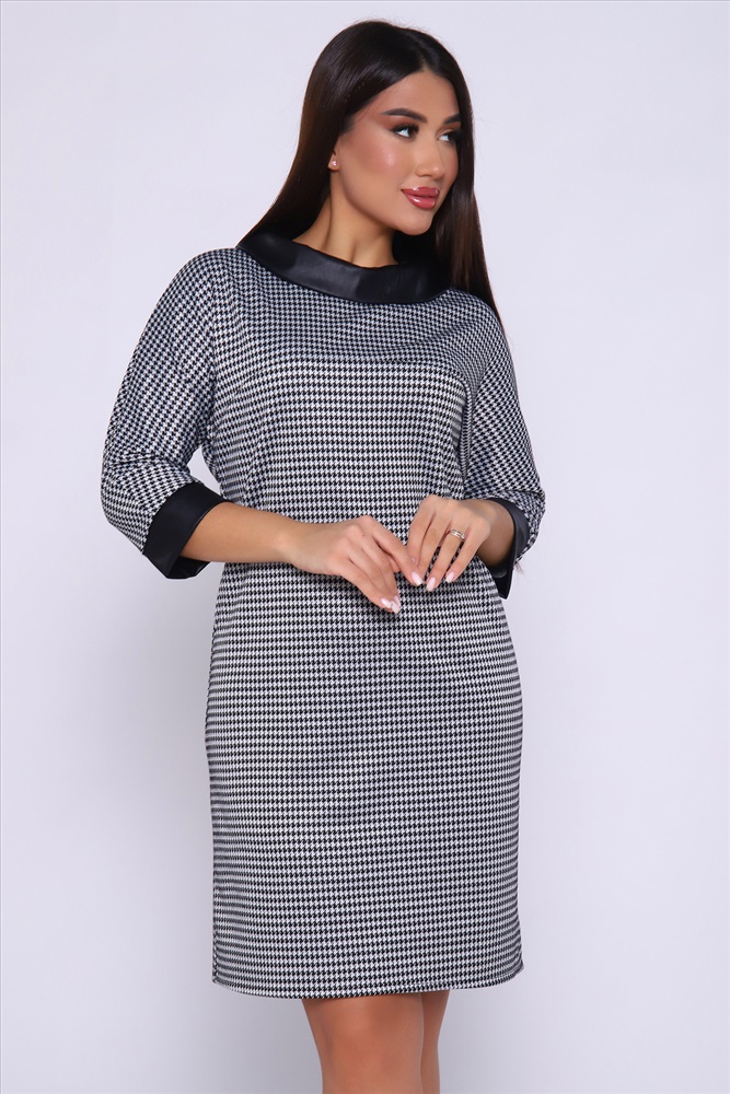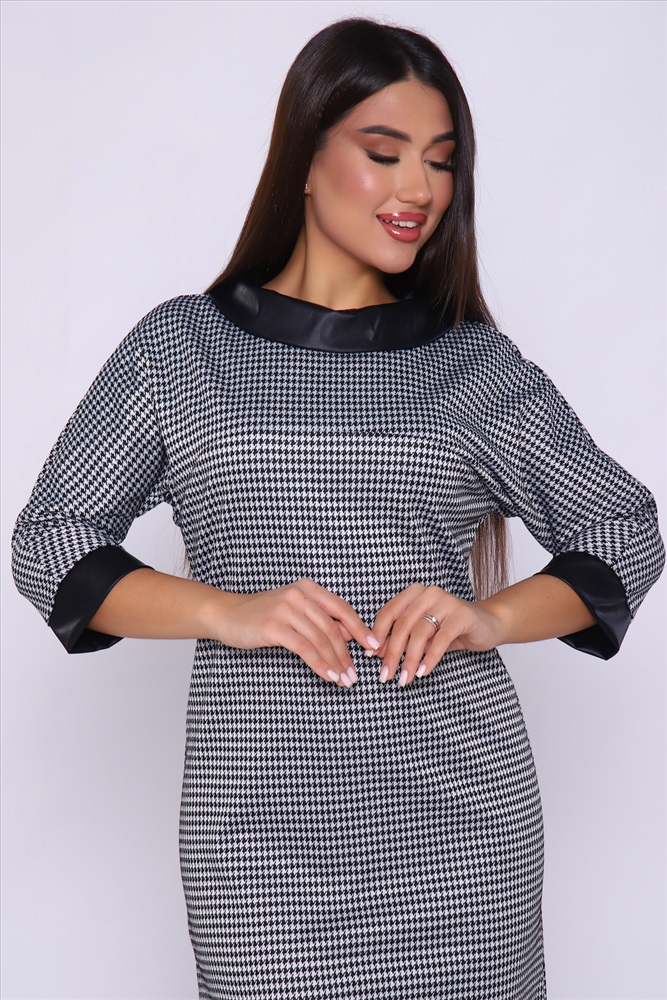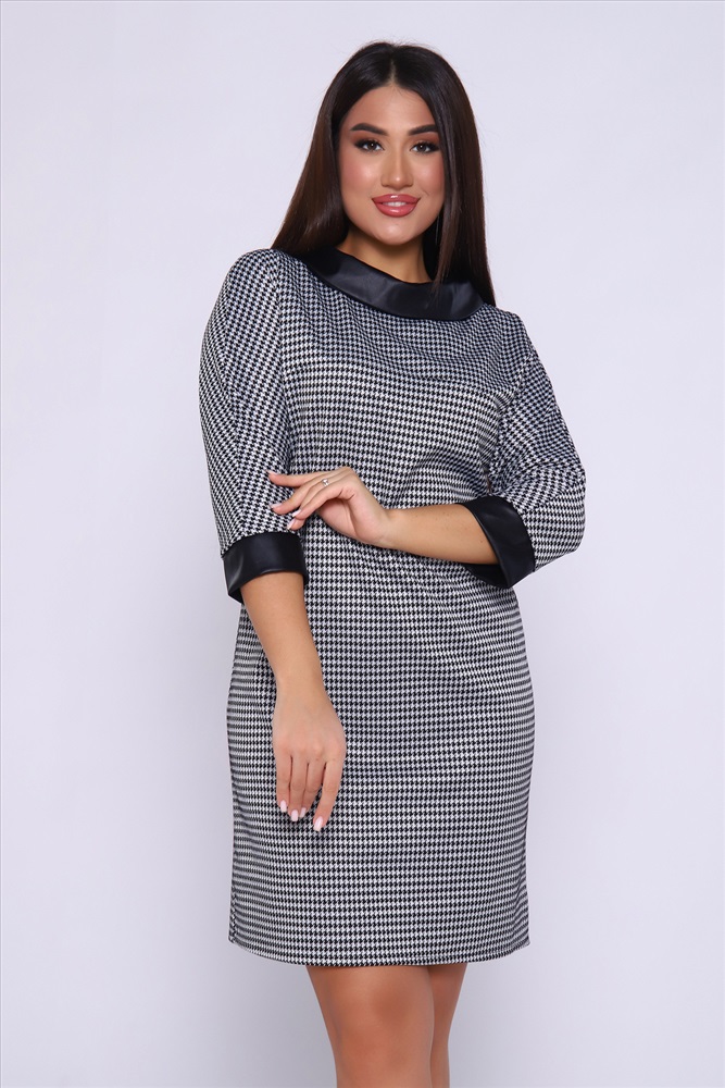 Застежка: без застежки Элегантное стильное платье подчеркнет вашу женственность и неповторимость. Модель платья подходит для дам разного возраста, поможет создать и деловой, и повседневный, и праздничный образ. Платье полуприталенного силуэта, кокетка на полочке выгодно подчеркнет линию груди, цельнокроеный рукав обеспечит свободу движения и скроет полноту рук. Длина платья до середины колена (при росте 164см), рукав длиной 3/4 (в замерах длина рукава указана от горловины). Изюминкой изделия являются манжеты и отложной воротник-лодочка из фактурной экокожи. Ткань трикотаж жаккард плотная и достаточно хорошо тянется, что обеспечивает безупречную посадку на любой фигуре. Классические расцветки в черно-белой гамме популярны во все времена. А обладательницам фигуры песочные часы талию можно подчеркнуть поясом или ремешком (платье продается без пояса).