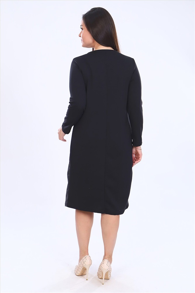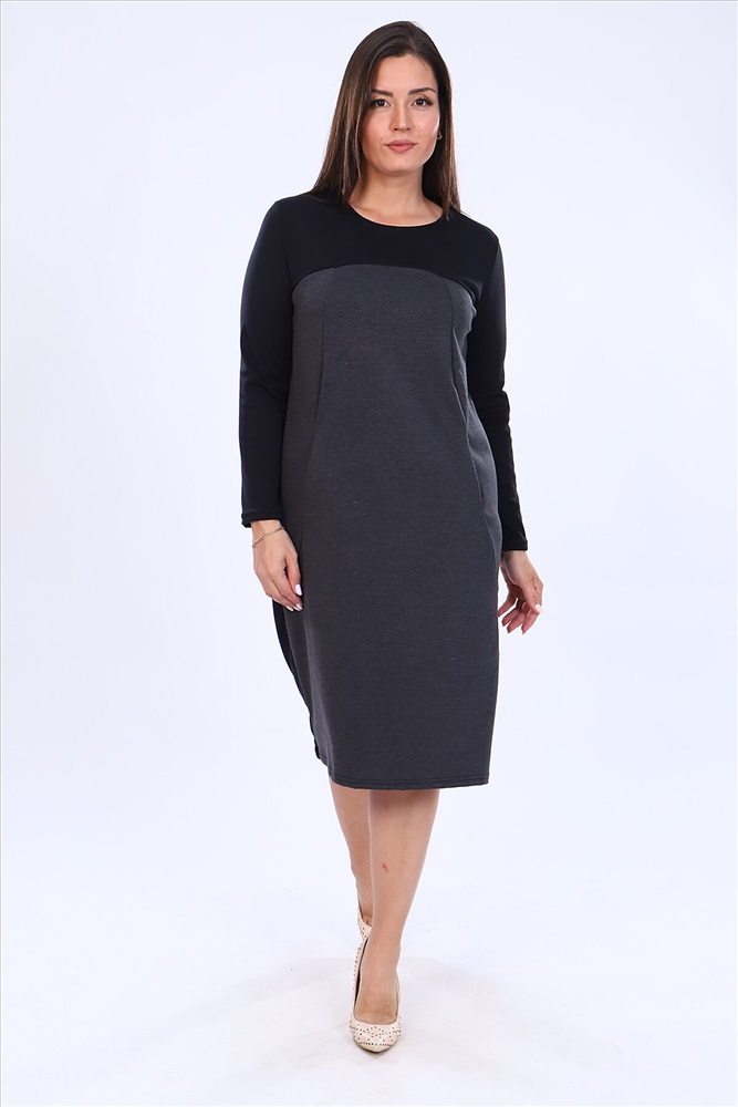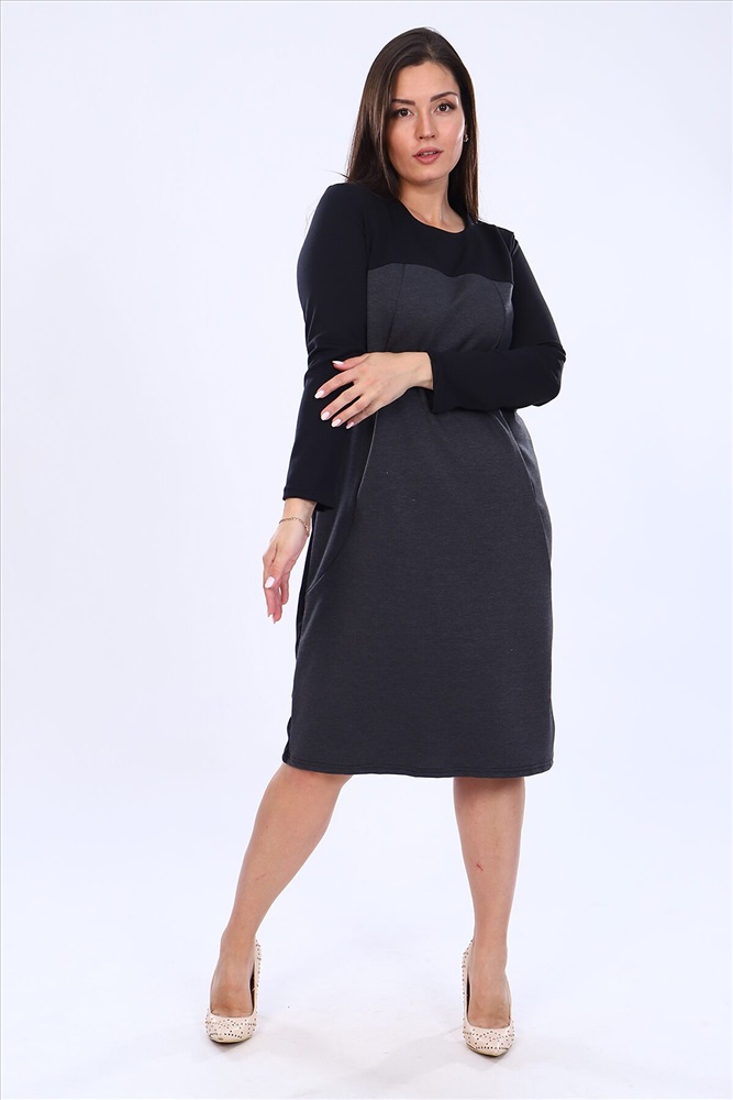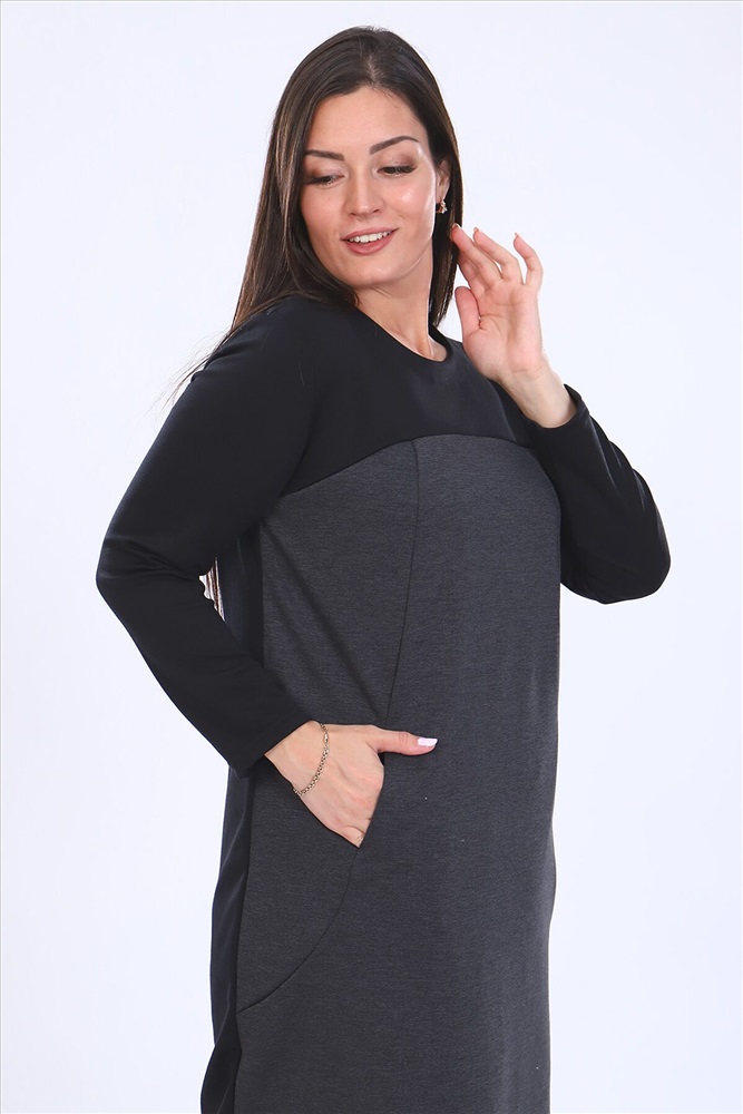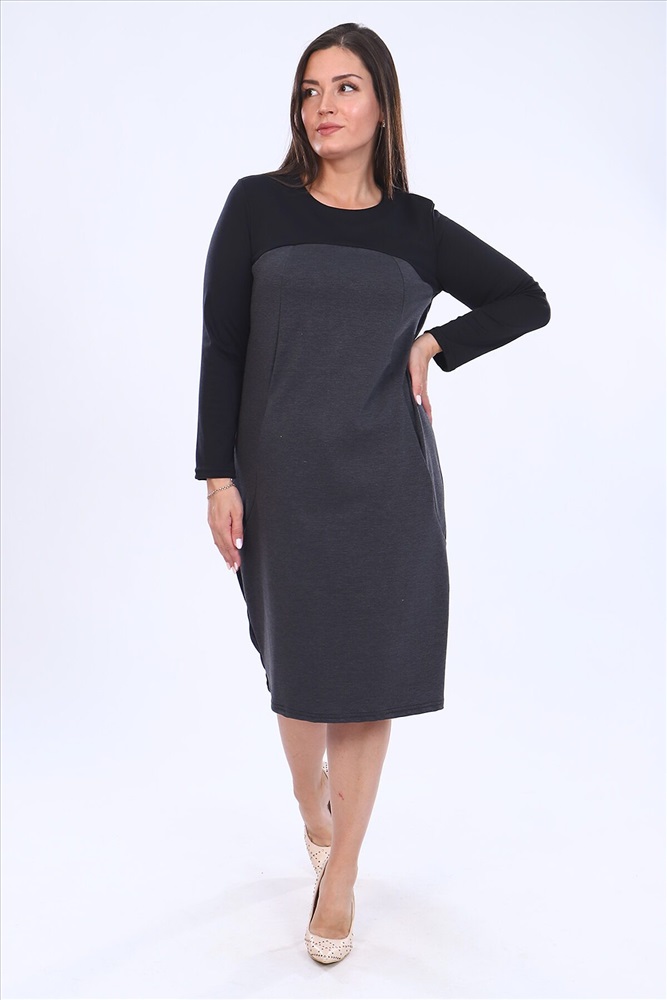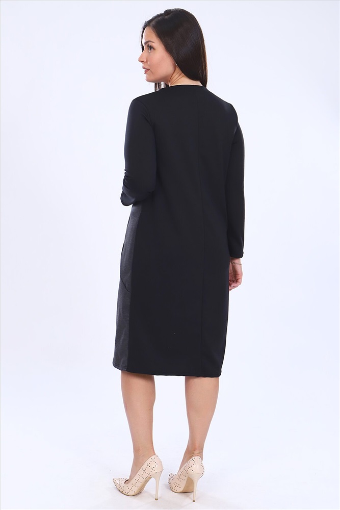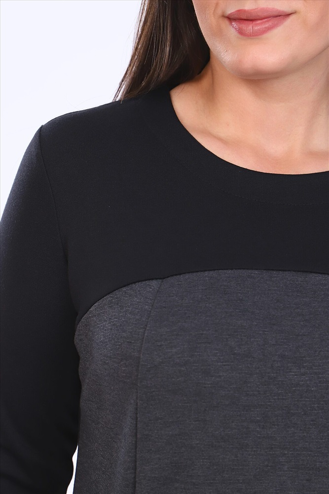Классическое черное платье, полочка со вставкой в цвете серый меланж, прямого кроя, округлая горловина, длинный рукав. Подойдет для офиса, повседневных и праздничных выходов.