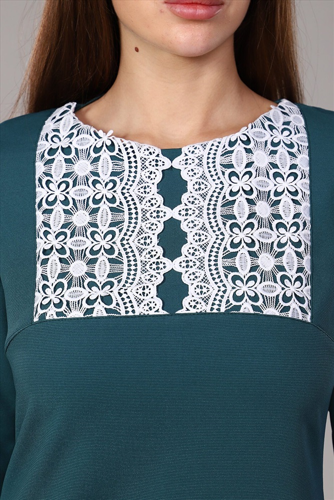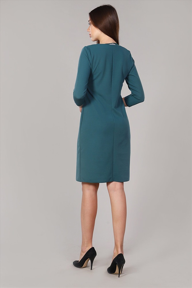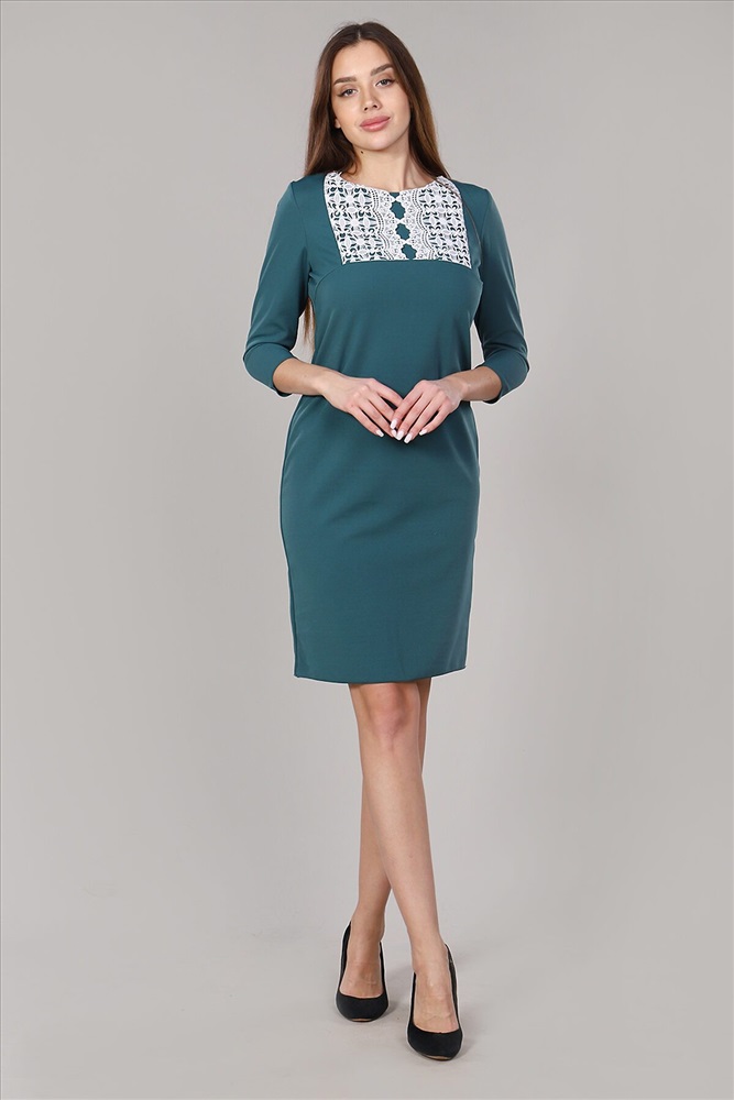 Платье приталенного силуэта. Рукав 3/4. На полочке кокетка, вставка из кружева. Вырез горловины обработан обтачкой.