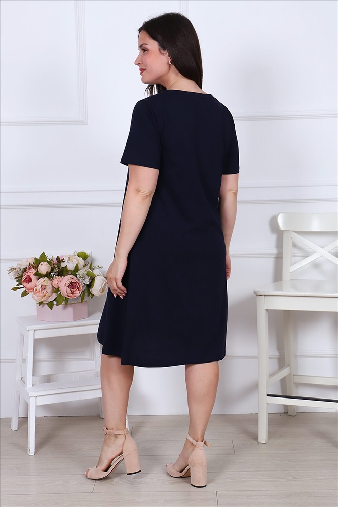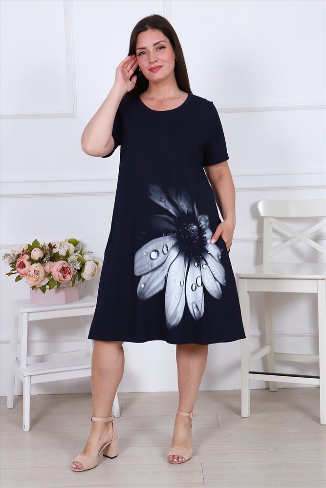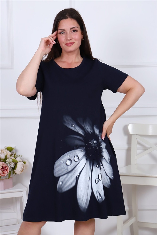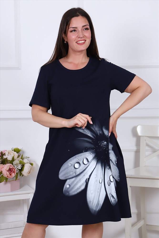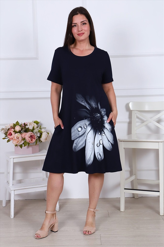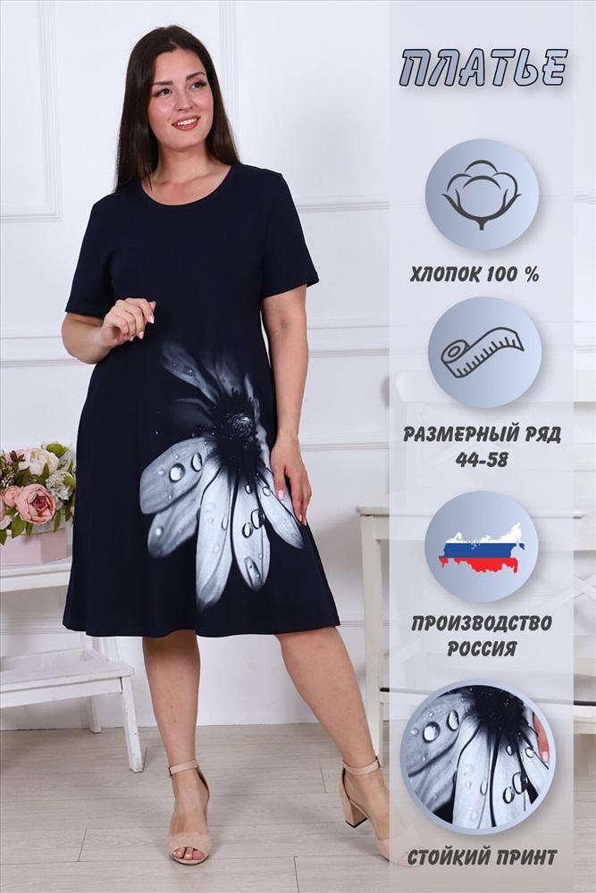 Платье женское из кулирного полотна, горловина круглая, рукав короткий, втачной, на полочке принт, в боковых швах карманы, низ изделия обработан на плоскошовной машине. Изделие легкое в уходе. Благодаря натуральному составу ткань позволяет вашей коже дышать. Платье прекрасно подойдет для дома, дачи, прогулок и отдыха.