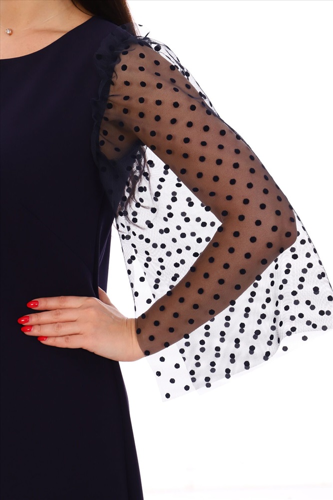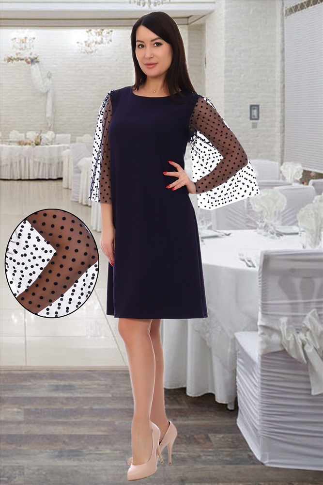 Элегантное платье полуприлегающего силуэта до колена, рукав из фатина в горошек, длина 3/4.