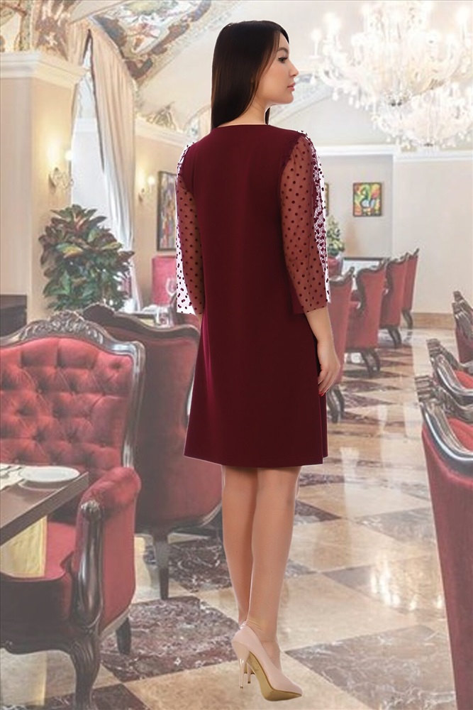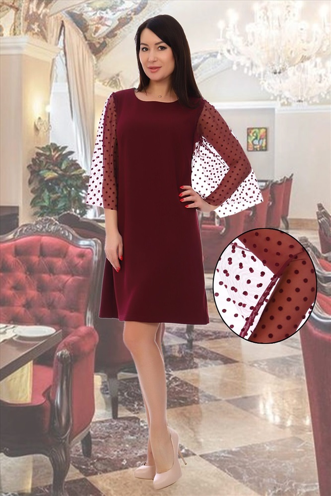Элегантное платье полуприлегающего силуэта до колена, рукав из фатина в горошек, длина 3/4.