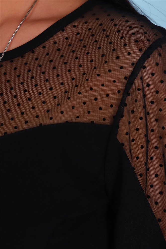Застежка: без застежки Платье женское - горловина круглая под окантовку, по груди и рукавам сетка в горошек, рукав 3/4 на манжете. Платье с рельефом по переду, длина до середины колена, по спинке шов. На модели 50 размер. Аксессуары в комплект не входят