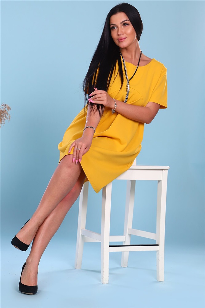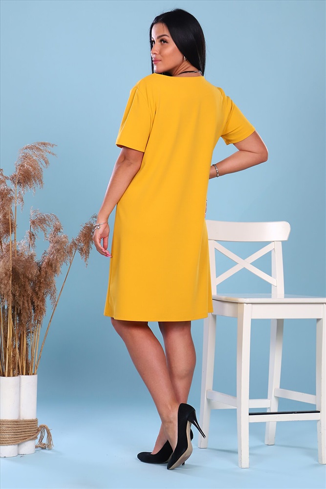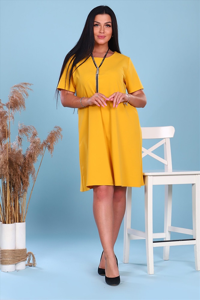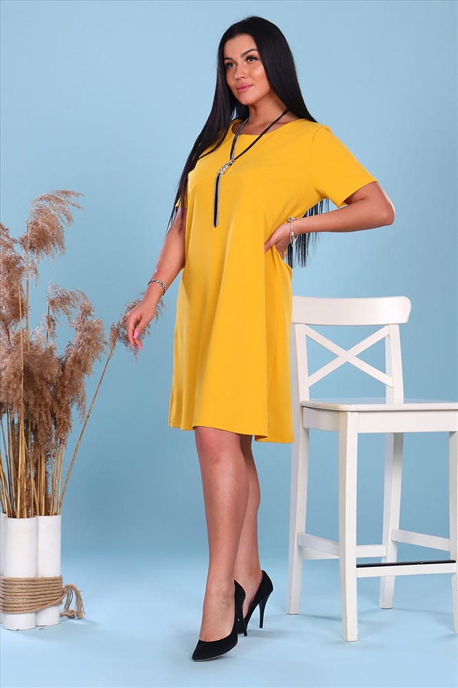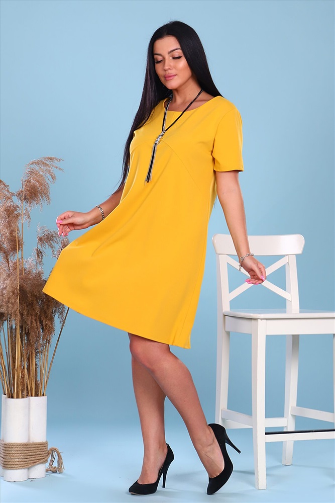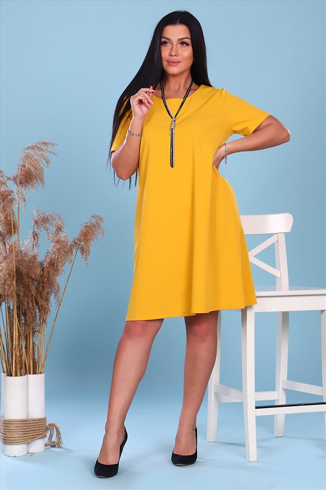 Легкое молодежное платье в ярких летних расцветках. Платье с круглой горловиной, короткий рукав, от линии груди расклешенное. Длина до середины колена. По спинке шов. Аксессуары в комплект не входят. На модели 50 размер.