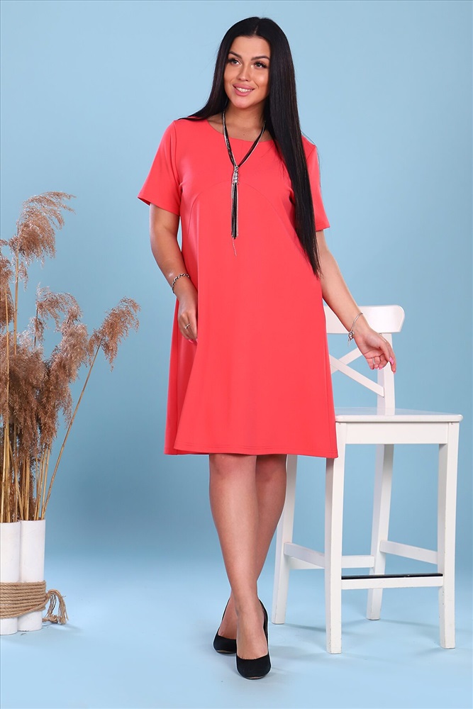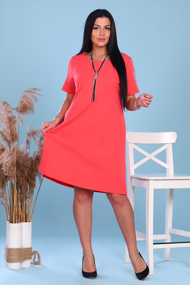 Легкое молодежное платье в ярких летних расцветках. Платье с круглой горловиной, короткий рукав, от линии груди расклешенное. Длина до середины колена. По спинке шов. Аксессуары в комплект не входят. На модели 50 размер.