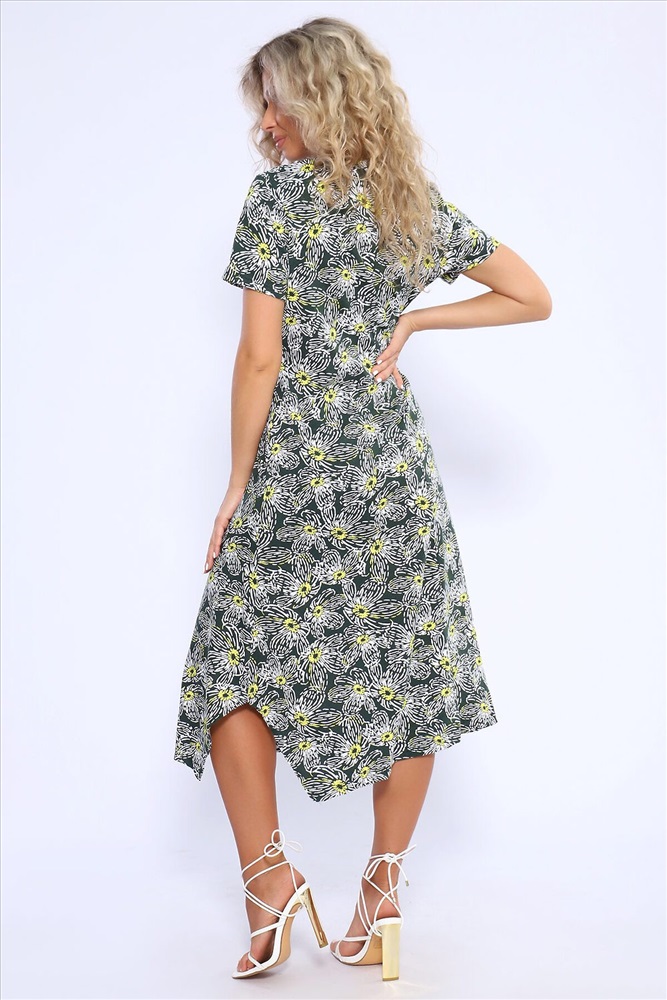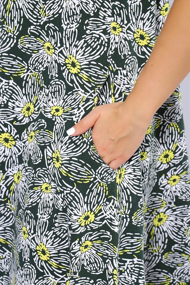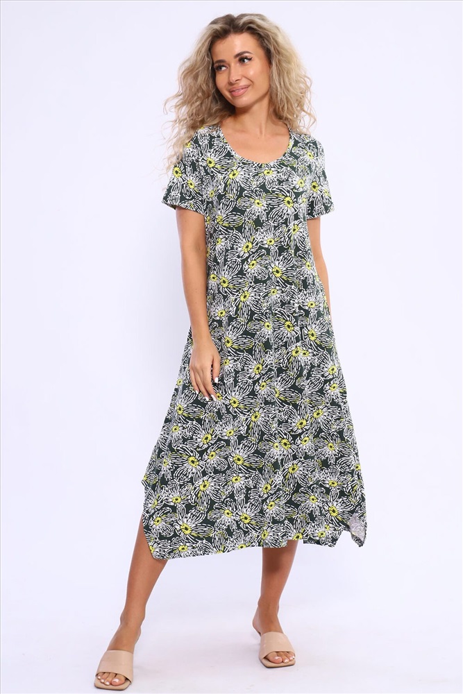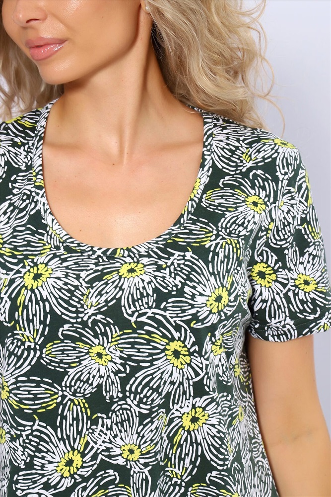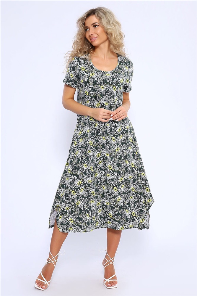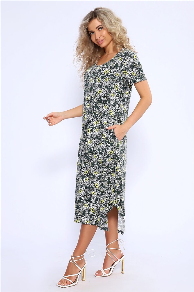 Страна производства: Россия Платье женское из натуральной хлопковой кулирки, удлиненное с фигурными вырезами в нижней части бобковых швов. Рукава вшивные короткие, есть боковые карманы. Восхитительный рисунок на ткани в виде контурных ромашек.