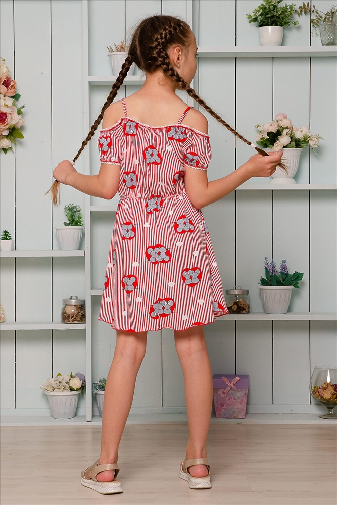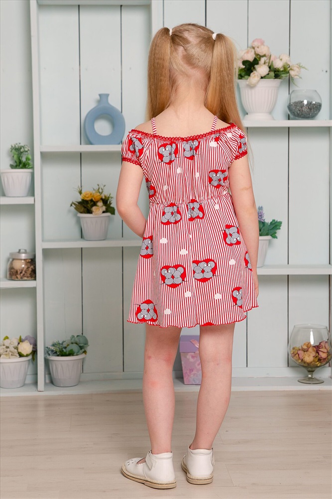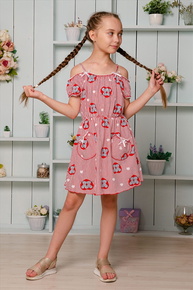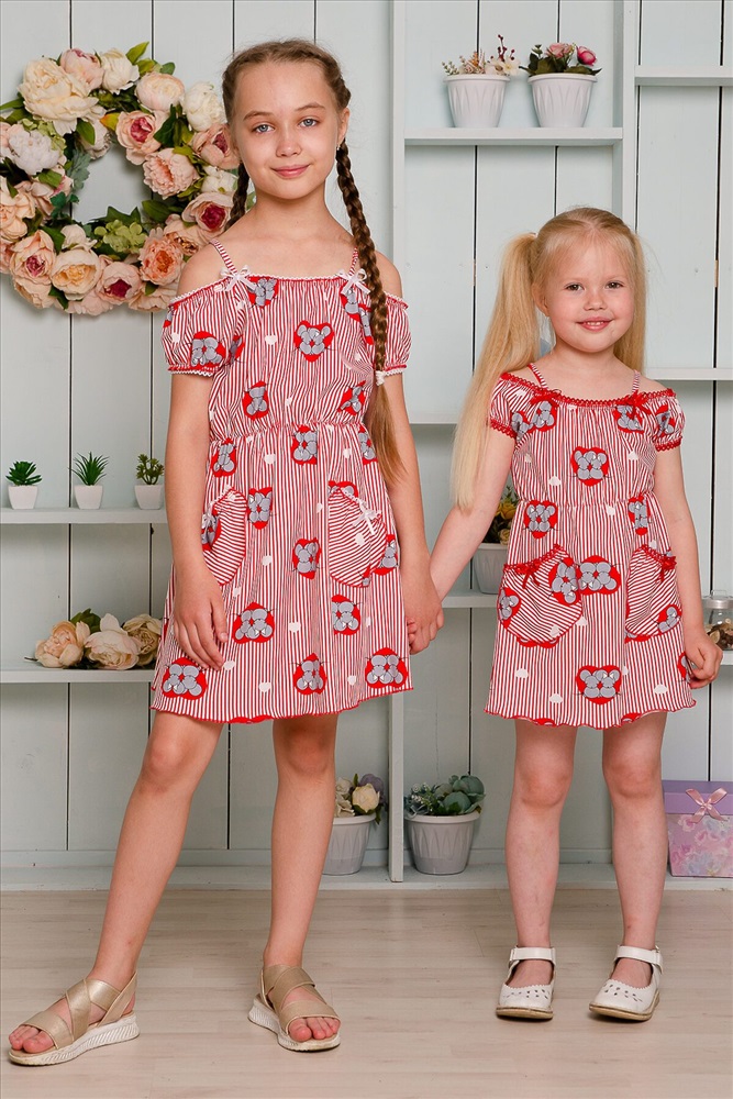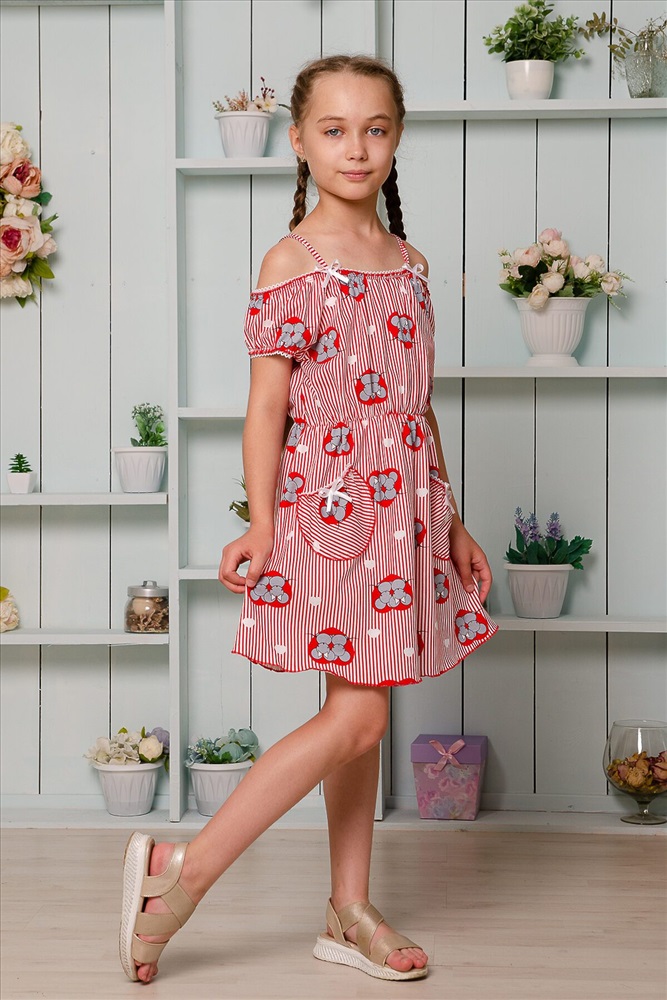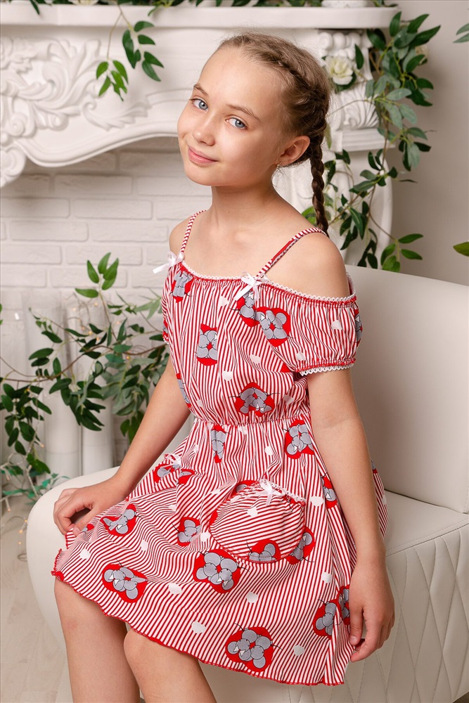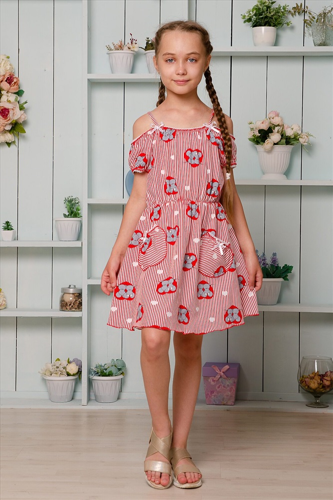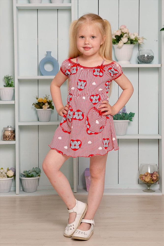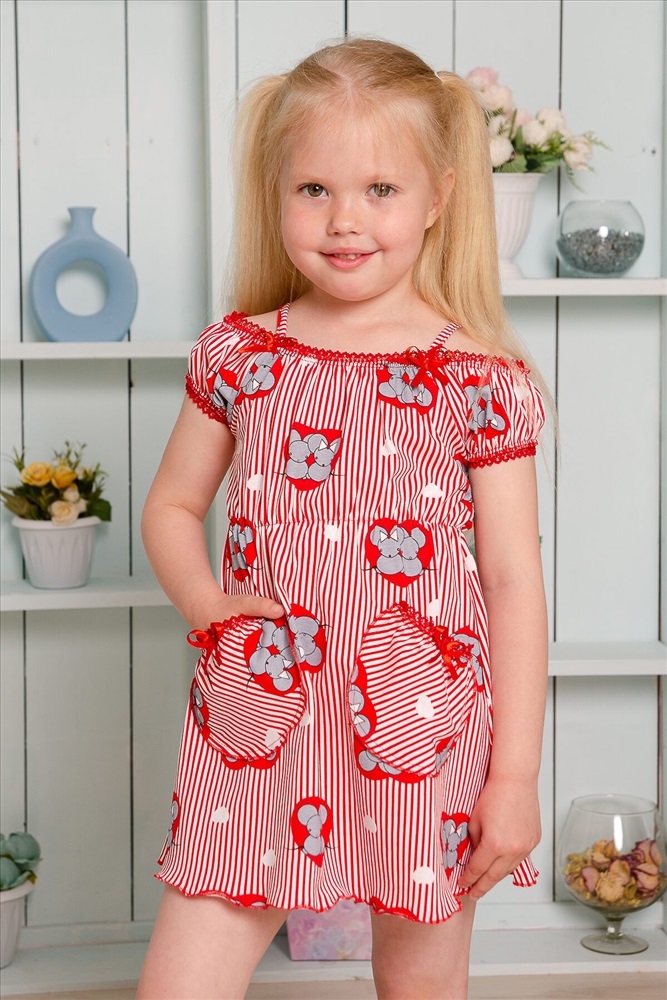 Страна производства: Россия Платье детское летнее. Приталенного силуэта, на тонких бретелях. Верх платья оформлен декоративной кружевной резинкой. По линии талии изделие собрано на тонкую резинку. Снизу на полочке два накладных кармашка с бантиками из атласной тесьмы. Все срезы изделия обработаны декоративной краеобметочной строчкой.