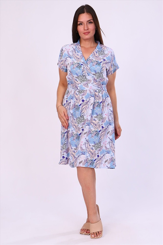 ID товара: 799635 Состав: 100% Полиэстер Сезон: Весна/Лето Длина: До колена Фасон: Расклешенное Рукав: Короткие Вырез горловины: V-образный Рисунок: растительный Декоративные элементы: Принт Основная ткань: Полиэстер | Софт Стиль: Повседневный Страна бренда: Россия Страна производства: Россия Летнее женское платье с V-образным воротником, пояс с кушаком. Легкое и удобное Комментарии к товару
