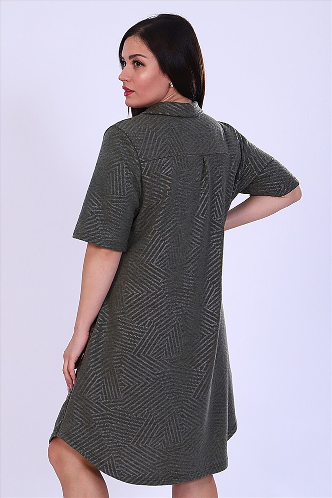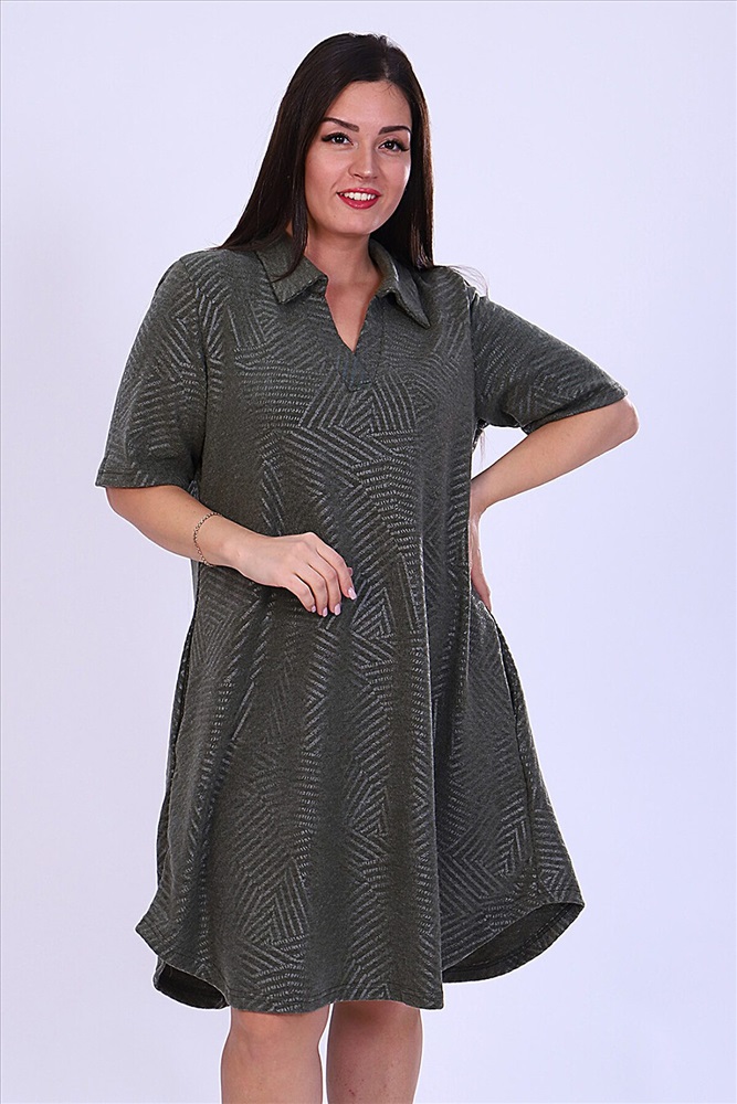 Страна производства: Россия Платье женское расклешенного типа, рукав 3/4 на манжете. V-воротник рубашечного типа, по бокам туники имеются внутренние карманы