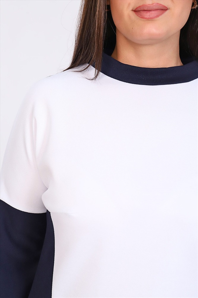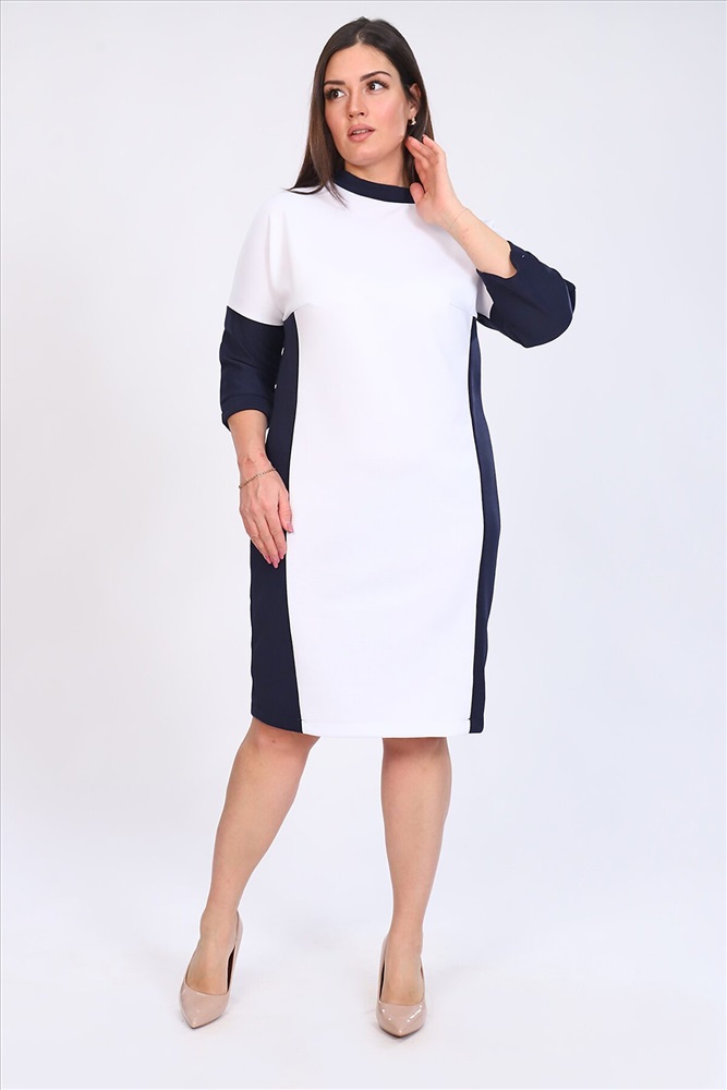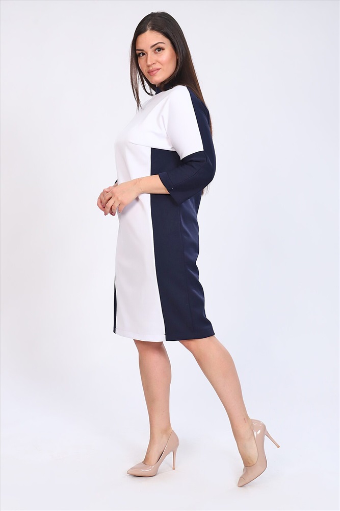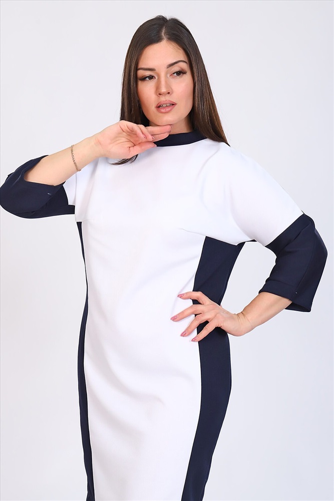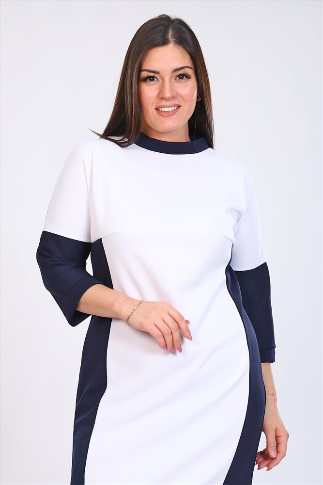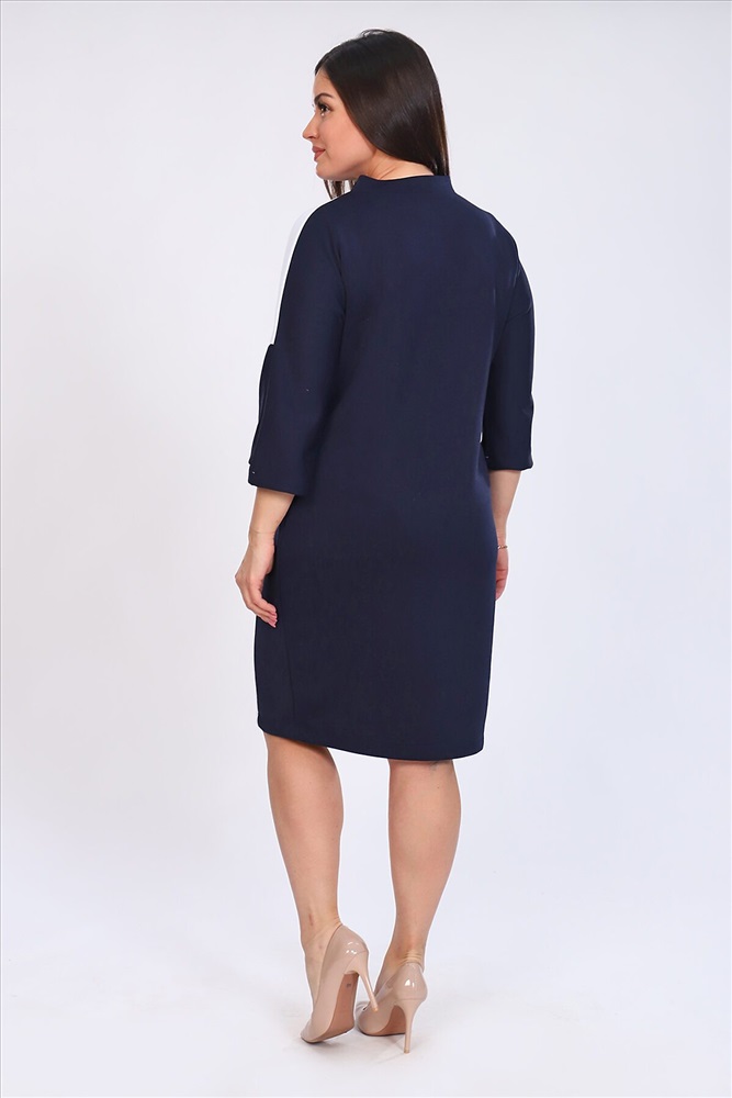 Платье женское комбинированное прямого силуэта, округлый воротник, спущенный рукав 3/4,длина рукава от шва. По линии груди вытачки. Элегантное и стильное платье.