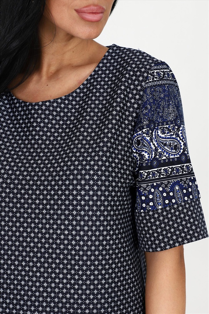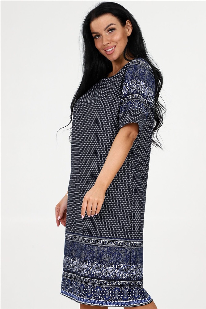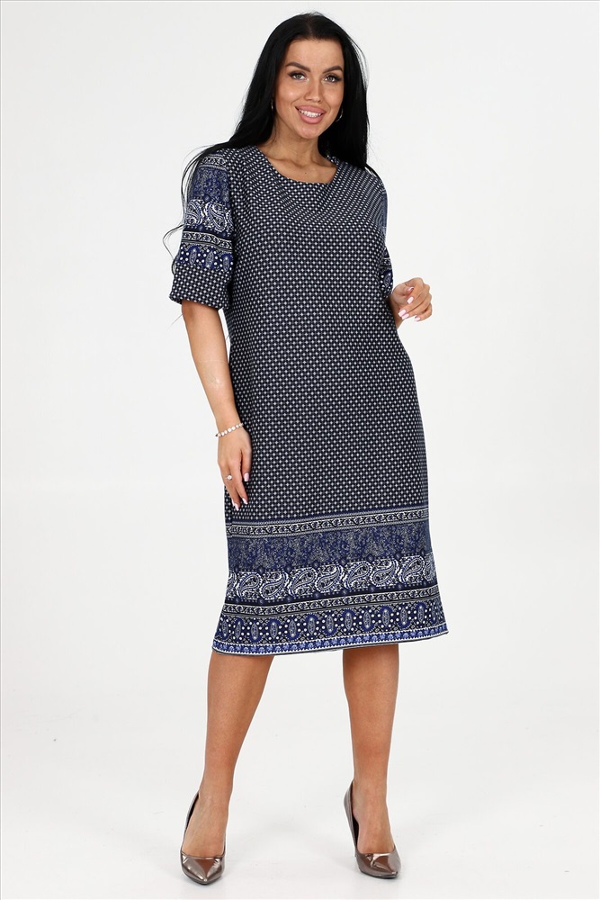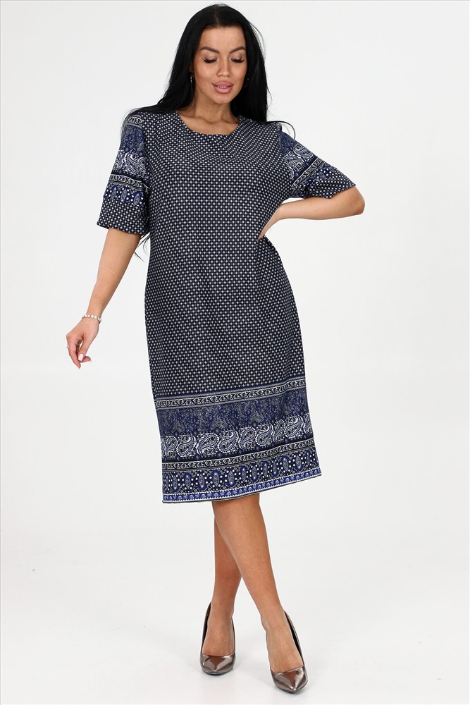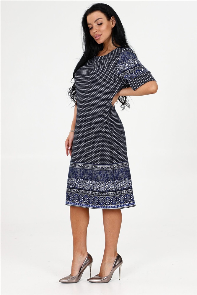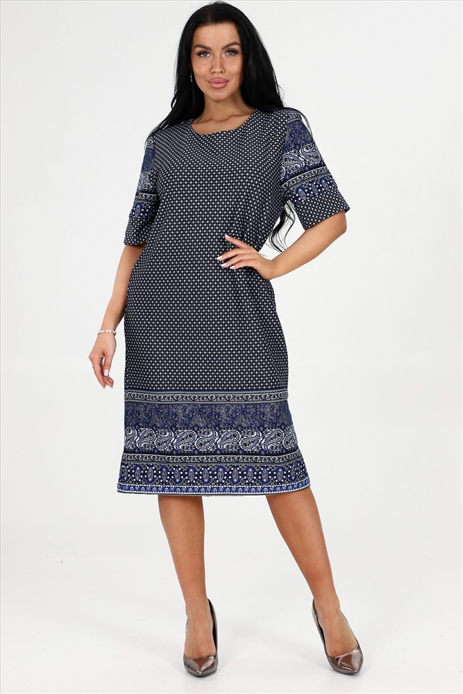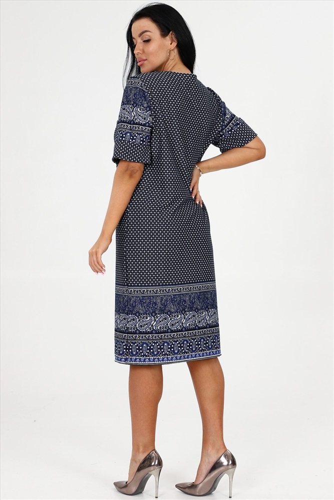 ID товара: 980433 Состав: 60% Полиэстер, 35% Вискоза, 5% Эластан Сезон: Весна/Лето Фасон: Прямой Рукав: Короткий Вырез горловины: Круглый Рисунок: Фантазийный Вид ткани: Трикотаж стрейч Страна бренда: Россия Страна производства: Россия Элегантное женское платье, прямого силуэта, округлый воротник. Рукав 3/4 на патах. Удобно и практично Комментарии к товару