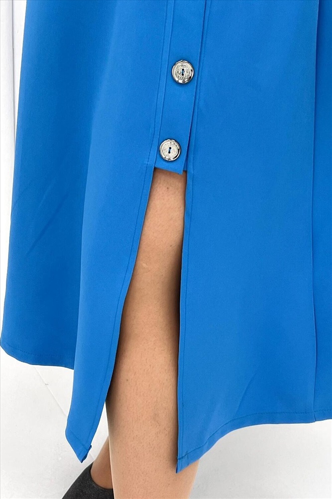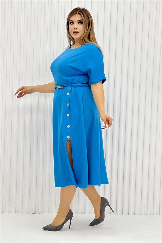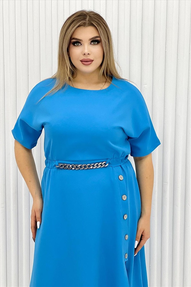 Страна производства: Россия Элегантное женское платье миди в голубом цвете. Изделие приталенное на резинке, с коротким рукавом (выше локтя), округлой горловиной и вырезом снизу, его дополняют декоративные элементы на поясе в виде цепочки и пуговиц от талии к вырезу. Платье подойдет на каждый день, на работу, на праздник. Деловое, но в то же время женственное.