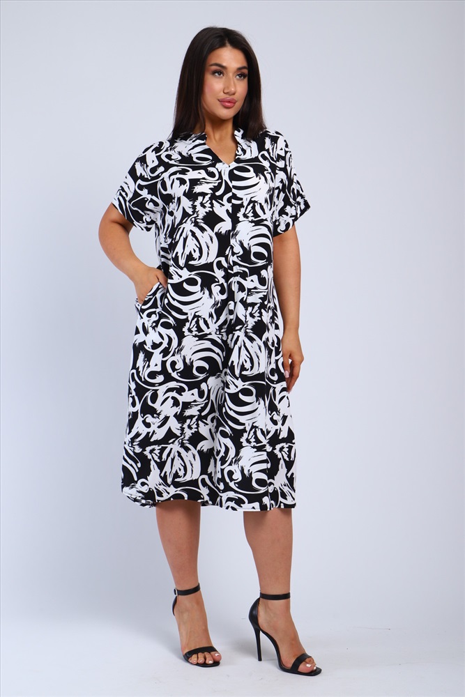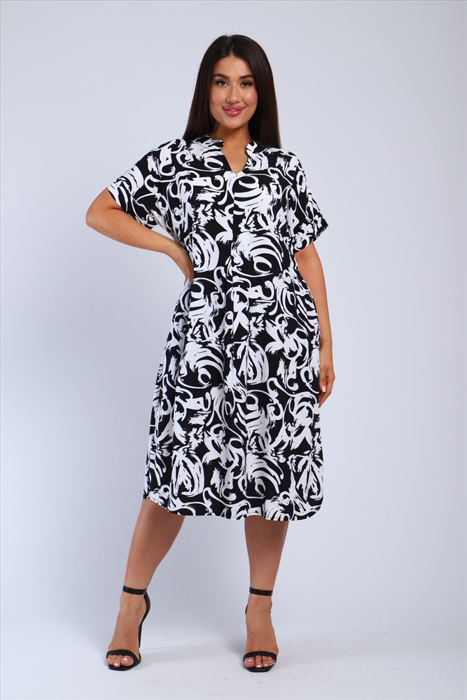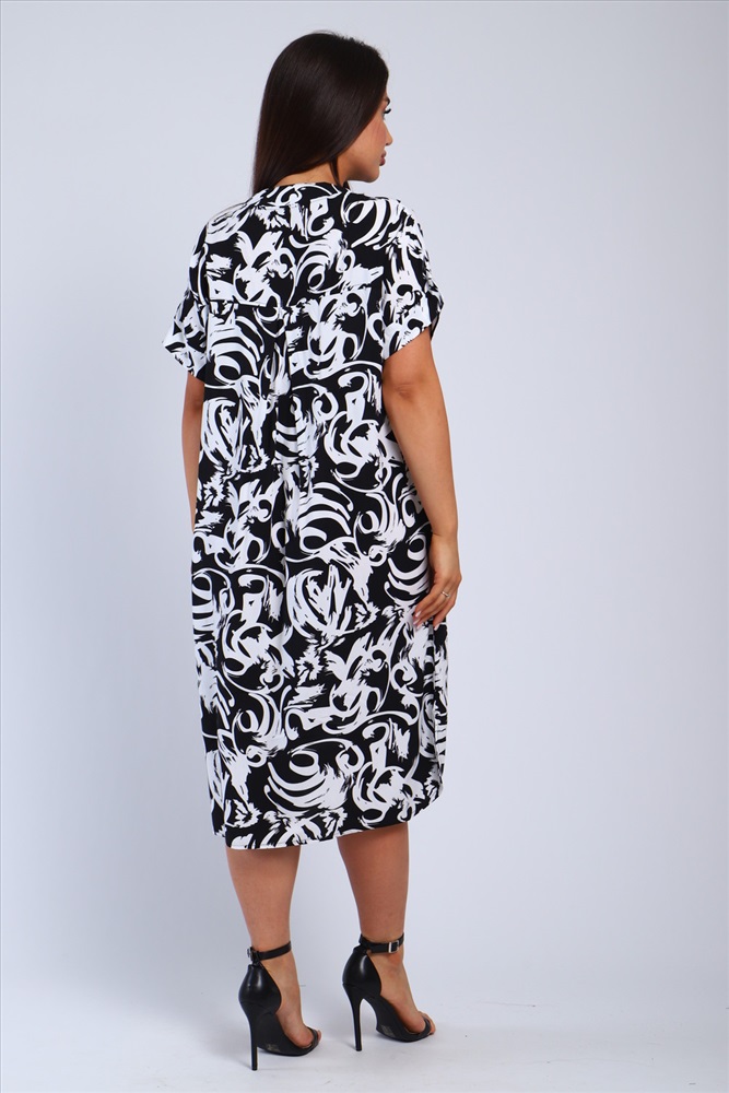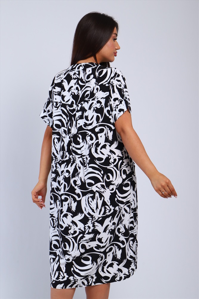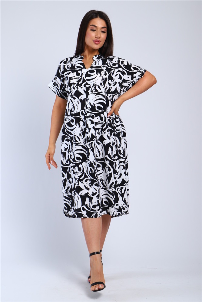 Застежка: без застежки Женское элегантное платье выполнено в свободном стиле, представлено в трех расцветках, с узорами. Изделие имеет округлую горловину с V - образым вырезом, рукава цельнокроеные. На задней и передней полочке имеются складочки, которые украшают платье и делают его низ волнообразным. Такая модель подойдет для жарких летних прогулок, на работу в офис, и за счет того, что оно просторное - для дома