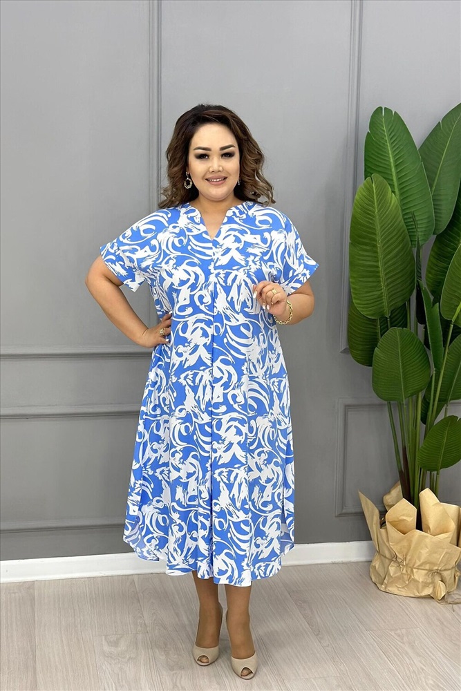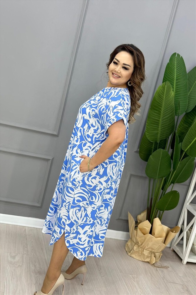 Женское элегантное платье выполнено в свободном стиле, представлено в трех расцветках, с узорами. Изделие имеет округлую горловину с V - образым вырезом, рукава цельнокроеные. На задней и передней полочке имеются складочки, которые украшают платье и делают его низ волнообразным. Такая модель подойдет для жарких летних прогулок, на работу в офис, и за счет того, что оно просторное - для дома