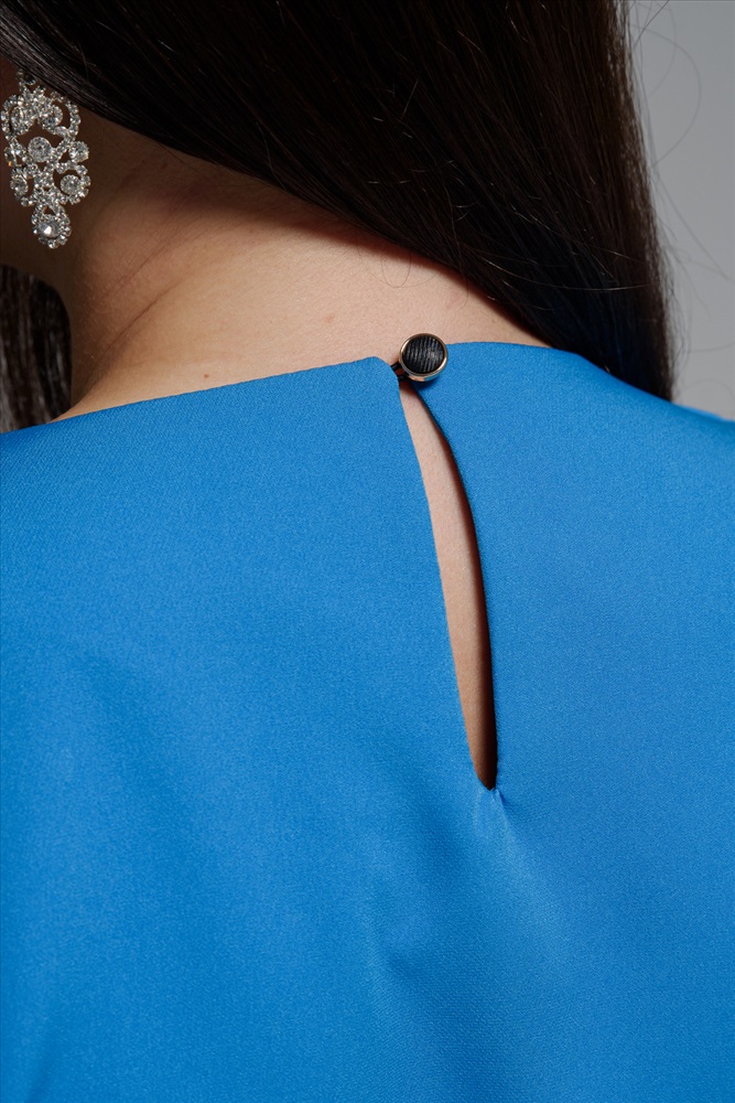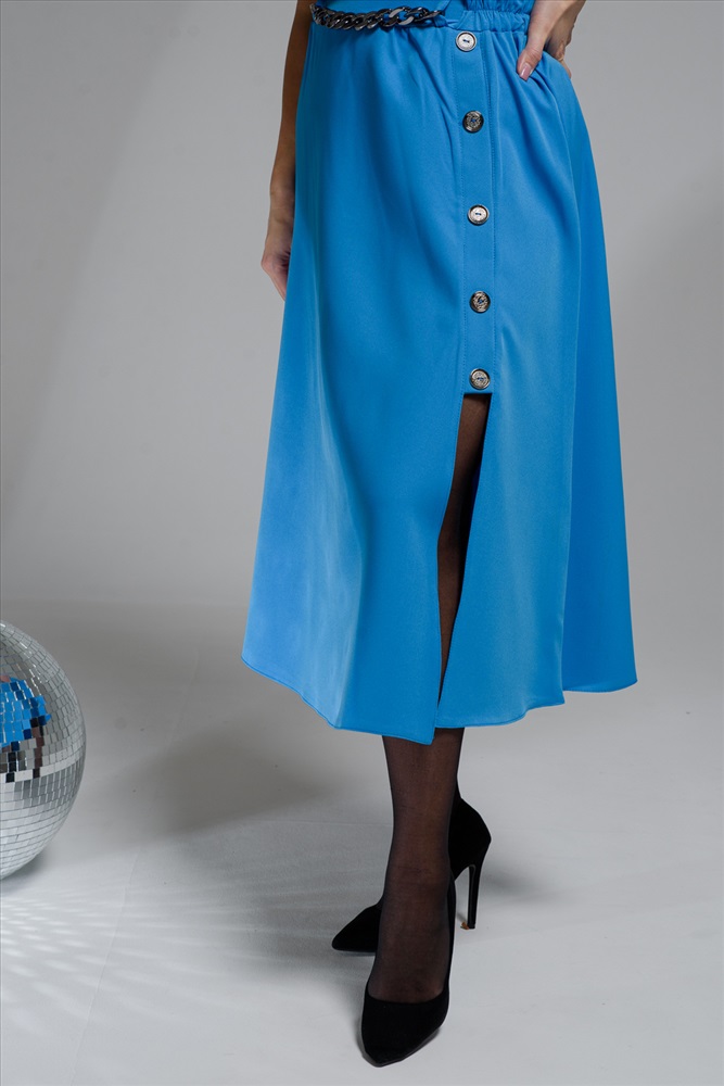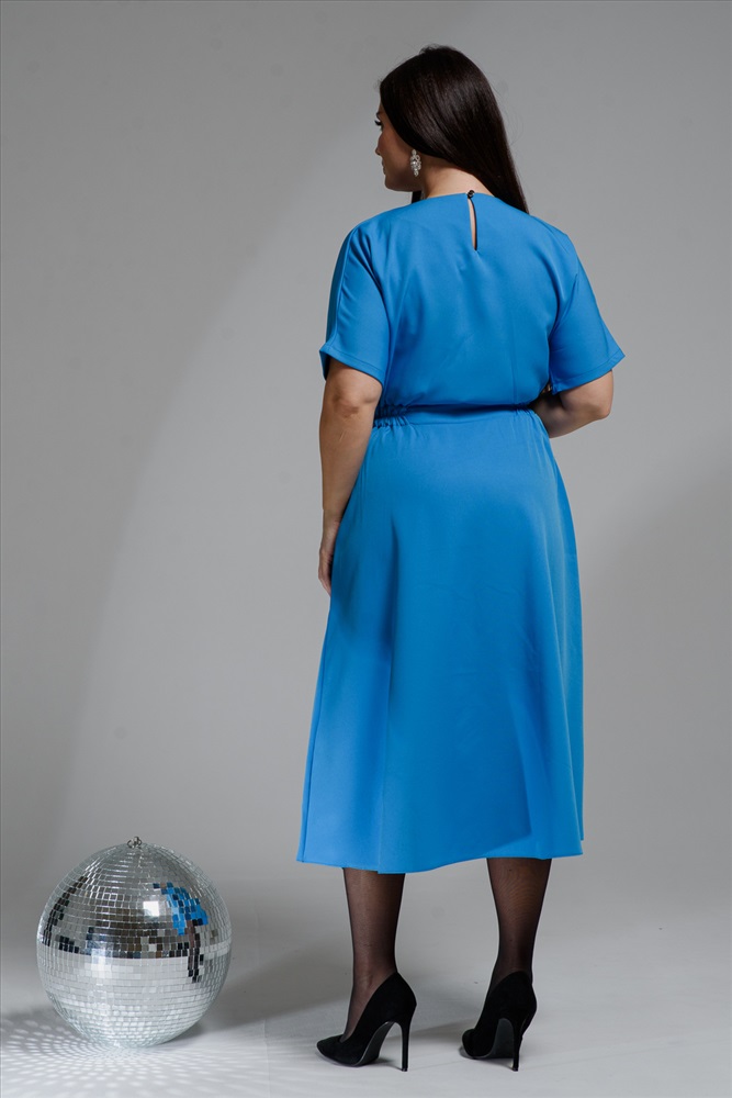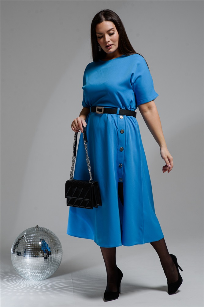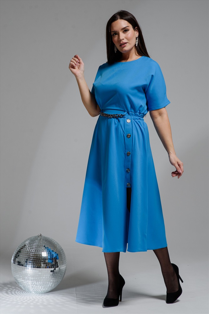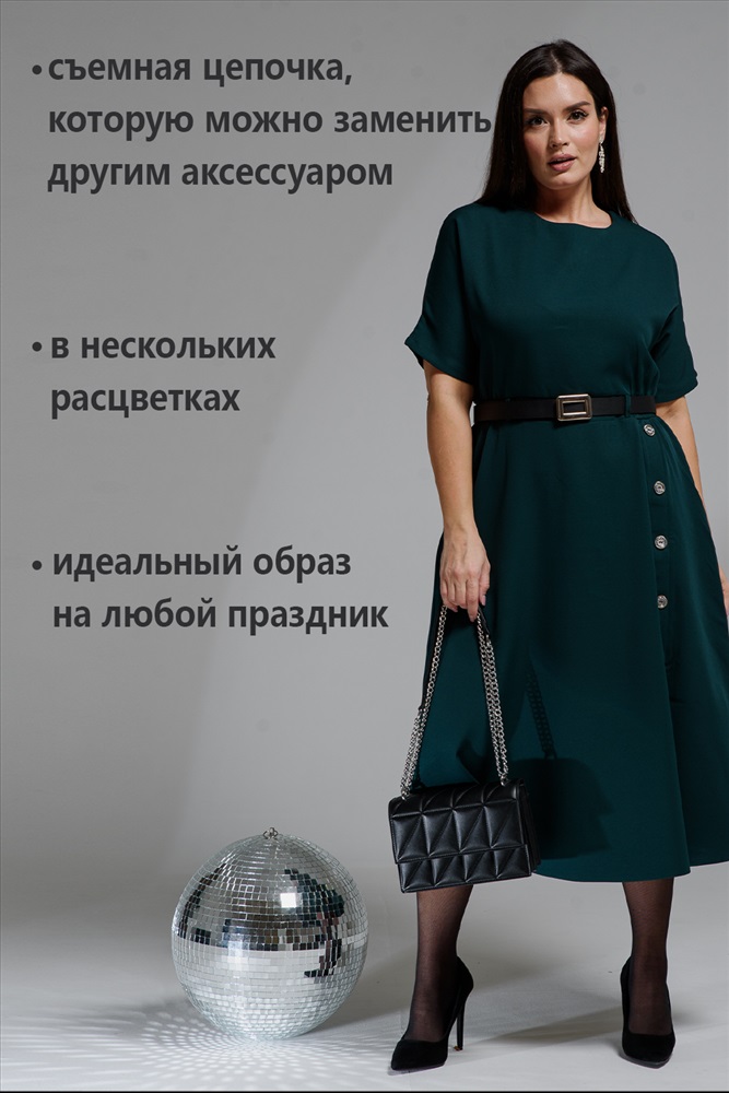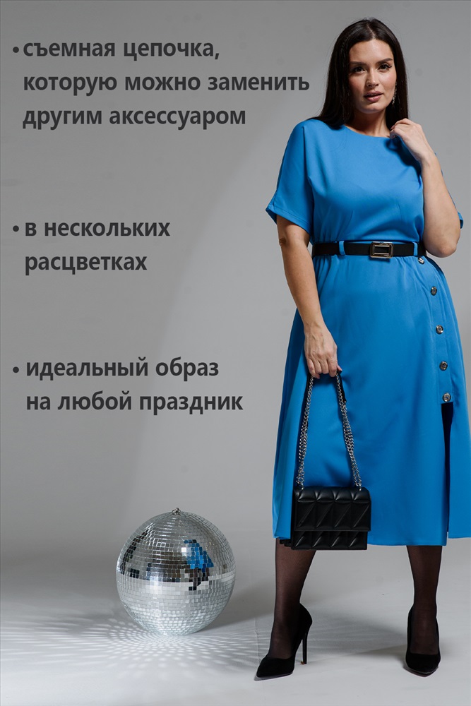 Застежка: без застежки Элегантное женское платье миди представлено в трех расцветках . Изделие приталенное на резинке, с коротким рукавом (выше локтя), округлой горловиной и вырезом снизу, его дополняют декоративные элементы на поясе в виде цепочки и пуговиц от талии к вырезу. Платье подойдет на каждый день, на работу, на праздник. Деловое, но в то же время женственное.