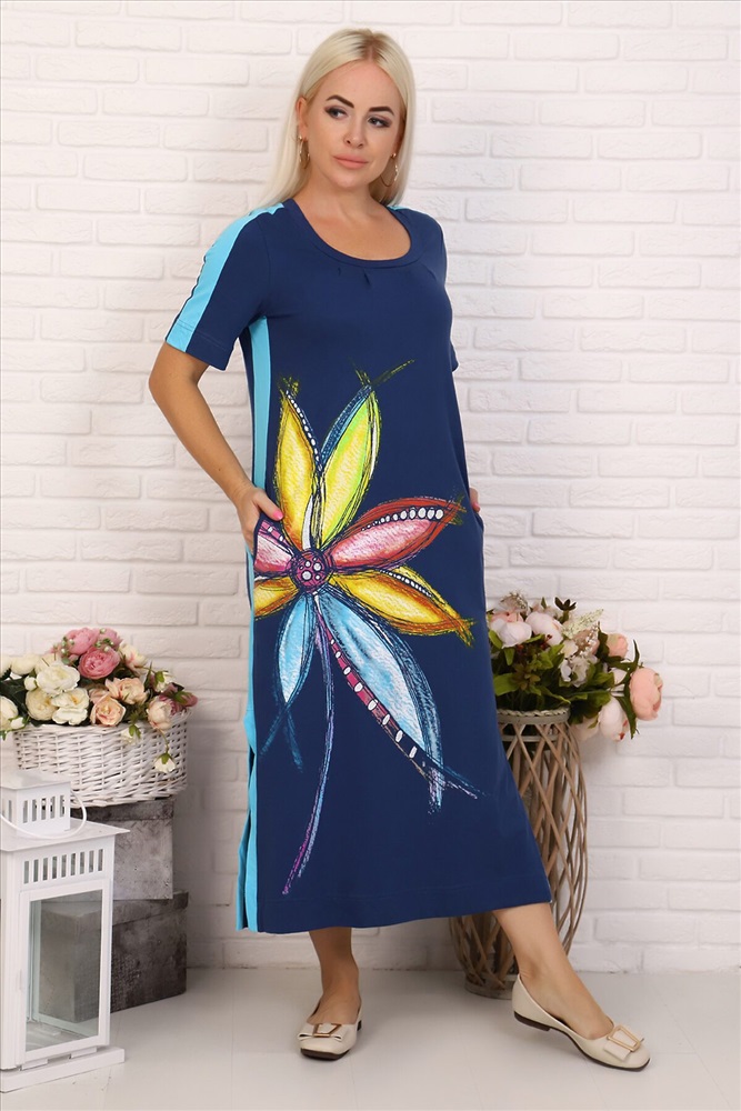 ID товара: 279998 Состав: 100% Хлопок Сезон: Весна/Лето Длина: Макси Фасон: Прямой Рукав: Короткий Рисунок: цветочный Тип карманов: Прорезные Основная ткань: Хлопок | Кулирка, Кулирка — это самое тонкое и гладкое трикотажное полотно, изготовленное из чистого хлопка. Полотно имеет характерную структуру- с лицевой стороны плоские «косички», с изнаночной – «кирпичная кладка». Особенности- гигроскопична, воздухопроницаема, при стирке, сушке и глажке не садится, хорошо держит форму, не образует складки. Стиль: Повседневный Страна бренда: Россия Страна производства: Россия Платье женское выполнено из трикотажного полотна 100% хлопок. Длиной до щиколотки. На платье выполнена печать. Горловина круглой формы, отделана обтачкой. Рукава и бока оформлены вставками из контрастной ткани. На данной модели имеются разрезы длиною до колен. Комментарии к товару