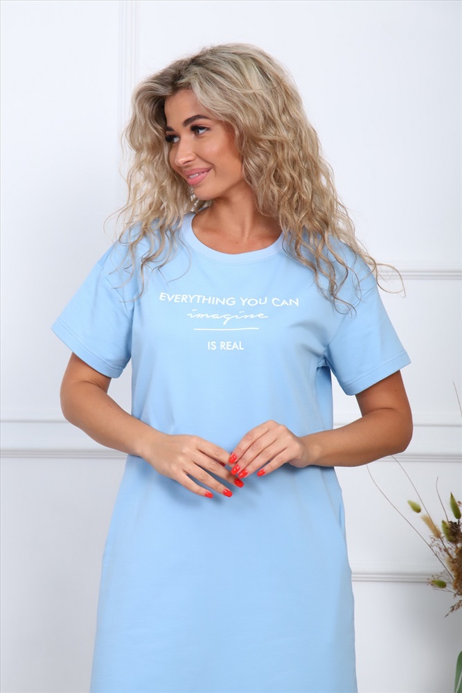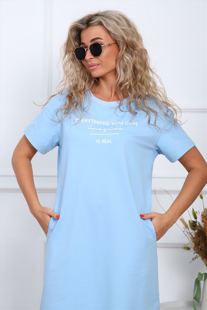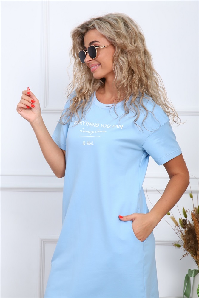 Застежка: без застежки Платье женское классическое с короткими рукавами, с двумя боковыми карманами, с принтом на груди.
