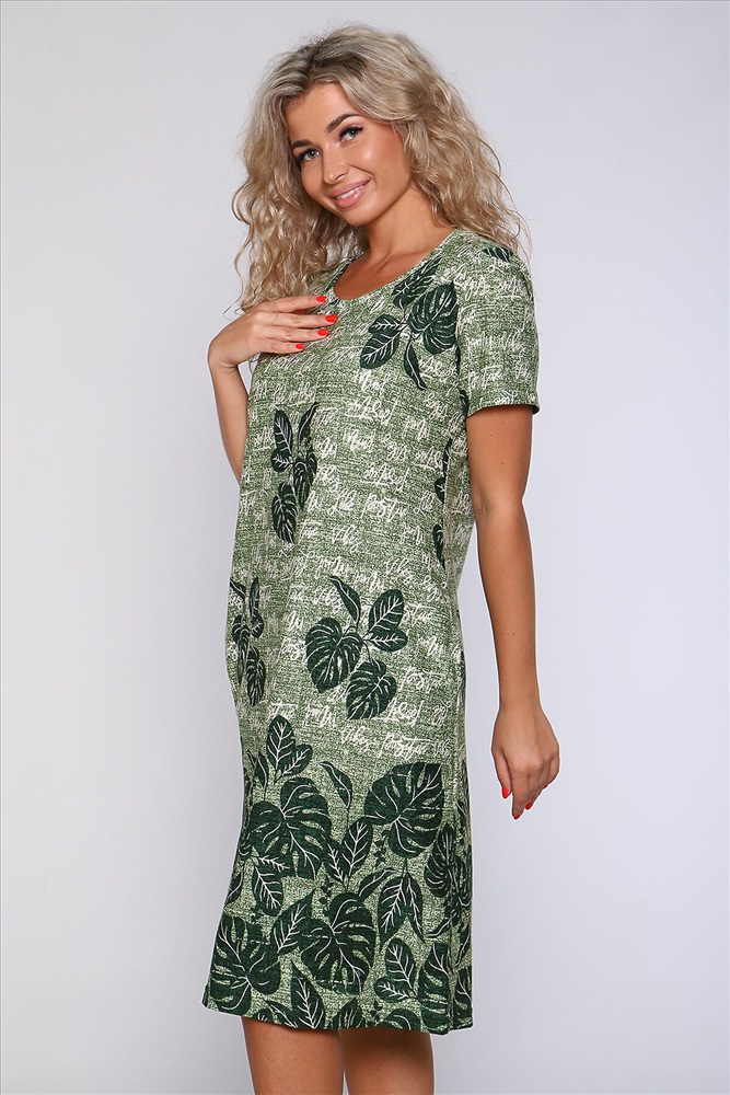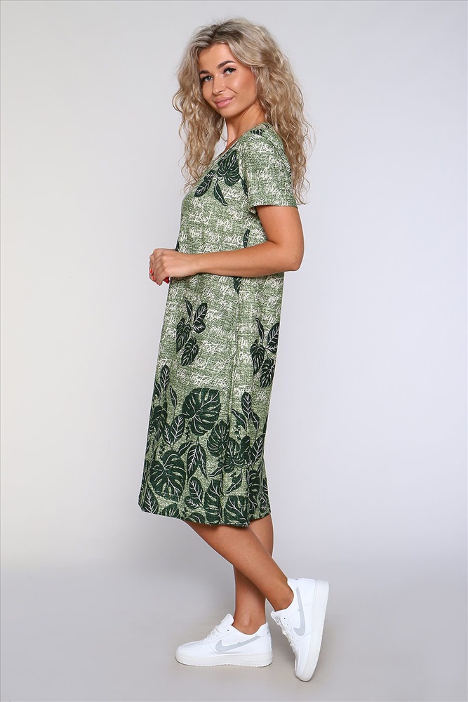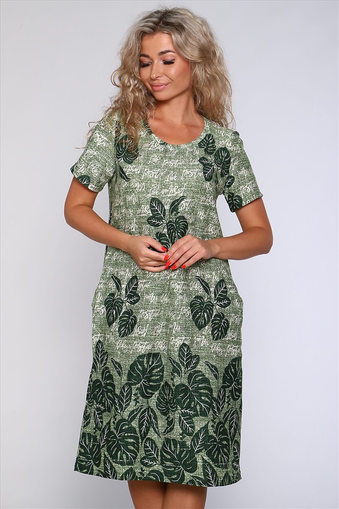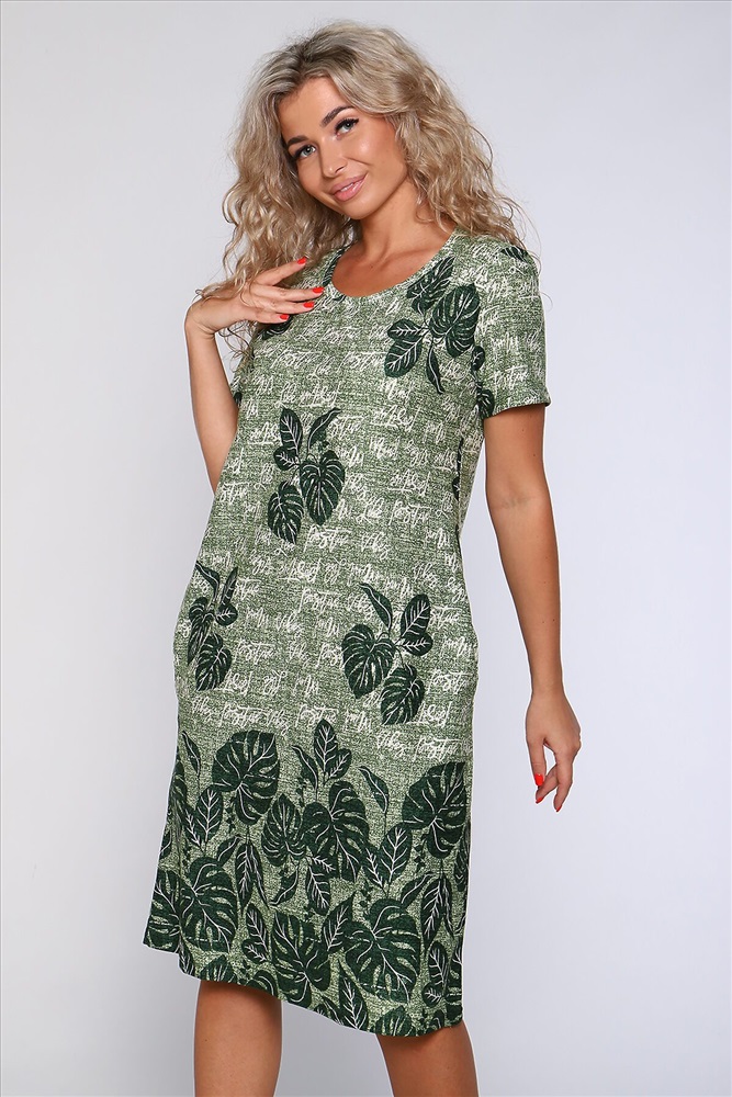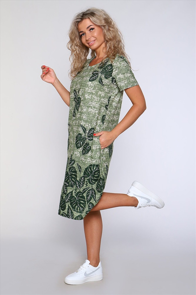 ID товара: 905922 Состав: 100% Хлопок Сезон: Весна/Лето Длина: Ниже колена Фасон: Полуприлегающий Рукав: короткие Вырез горловины: Округлый Рисунок: растительный Тип карманов: В шве Декоративные элементы: Принт Основная ткань: Хлопок Стиль: повседневный Вид ткани: Кулирка Страна бренда: Россия Страна производства: Россия Платье полуприлегающего силуэта с короткими рукавами и карманами в боковых швах. Комментарии к товару