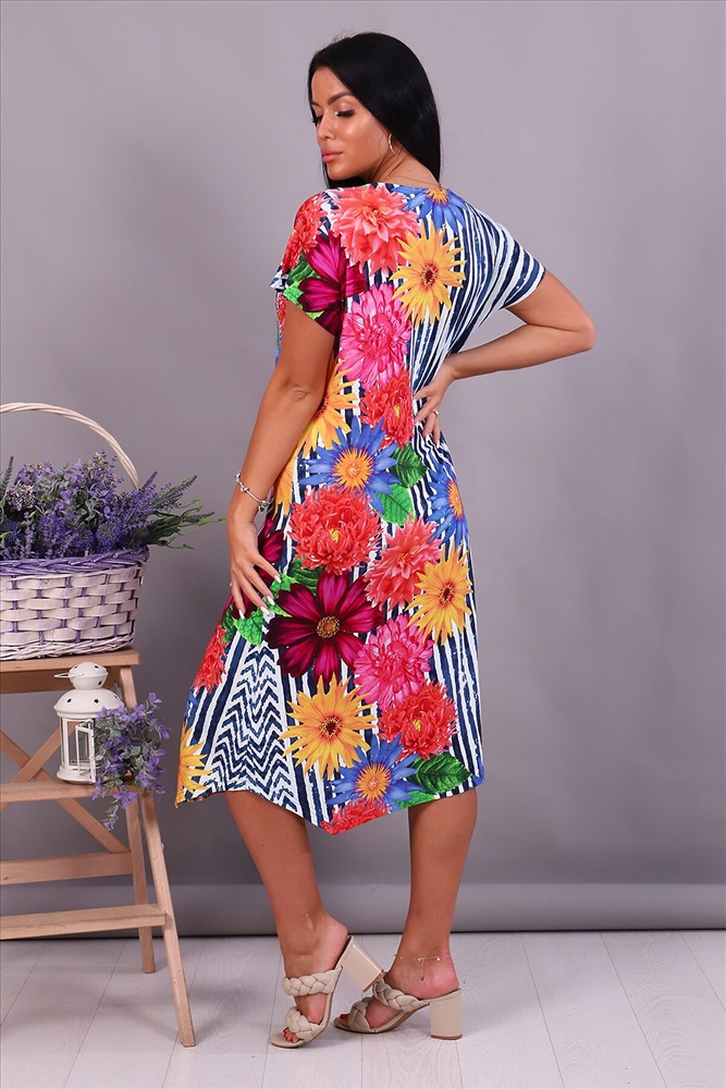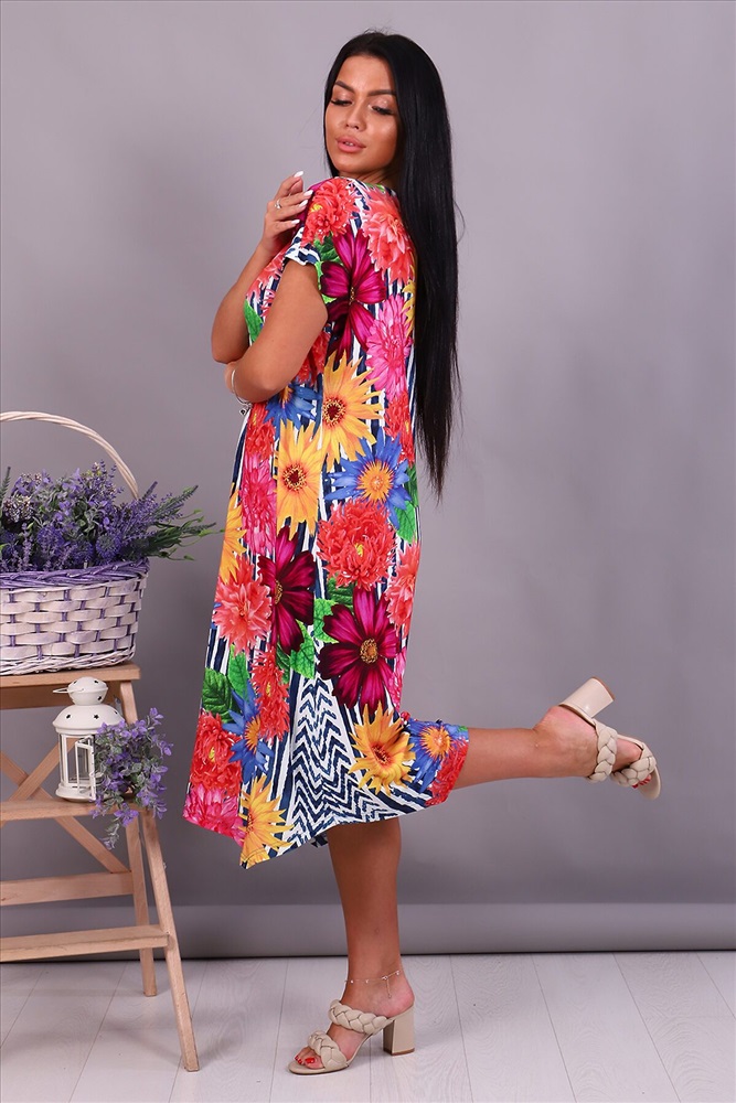 Женское платье свободного кроя с коротким спущенным рукавом, полукруглой горловиной и фигурным низом. Подходит для домашнего и уличного ношения, для отдыха, для дачи, в отпуск на море. Летнее платье-сарафан сшито из мягкого и нежного вискозного полотна, которое очень приятно к телу, гигроскопично, не скатывается и не линяет. Свободное платье не стесняет движения и подойдет для любого типа фигуры, скрывает недостатки и подчеркивает достоинства. Прекрасно сидит на любой фигуре. Большие размеры, подойдет беременным и молодым мамам. Яркие стойкие цвета ткани. Прекрасный подарок девушкам, женщинам, девочкам на день рождения, юбилей или другой праздник.