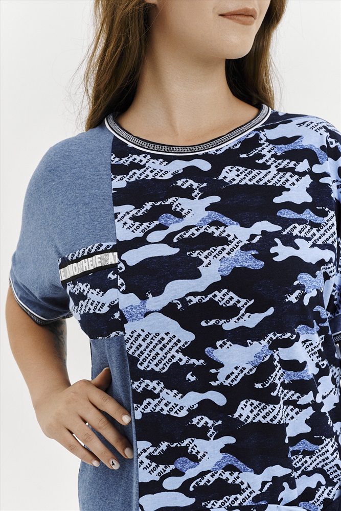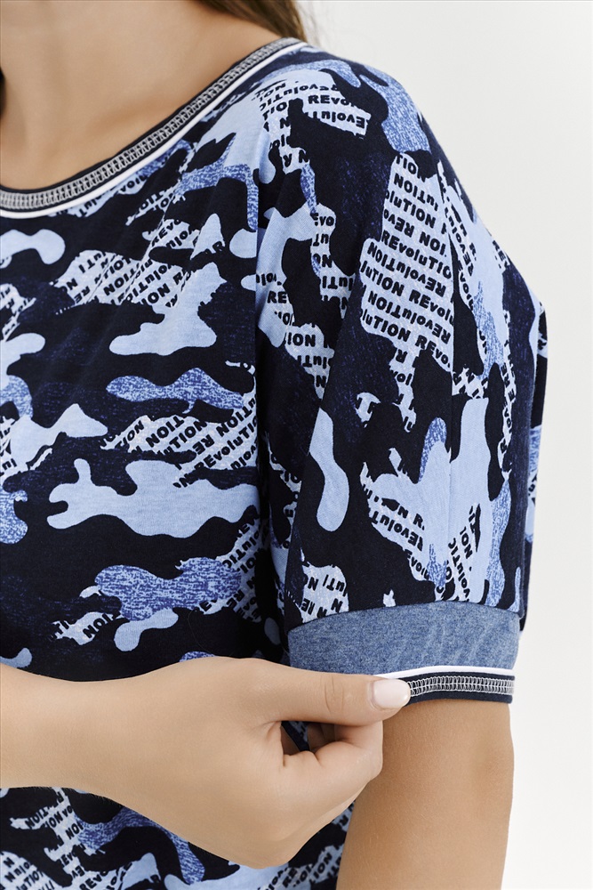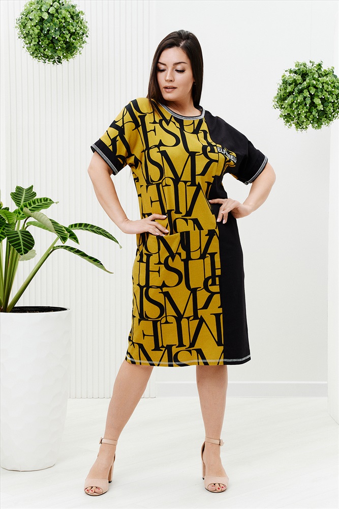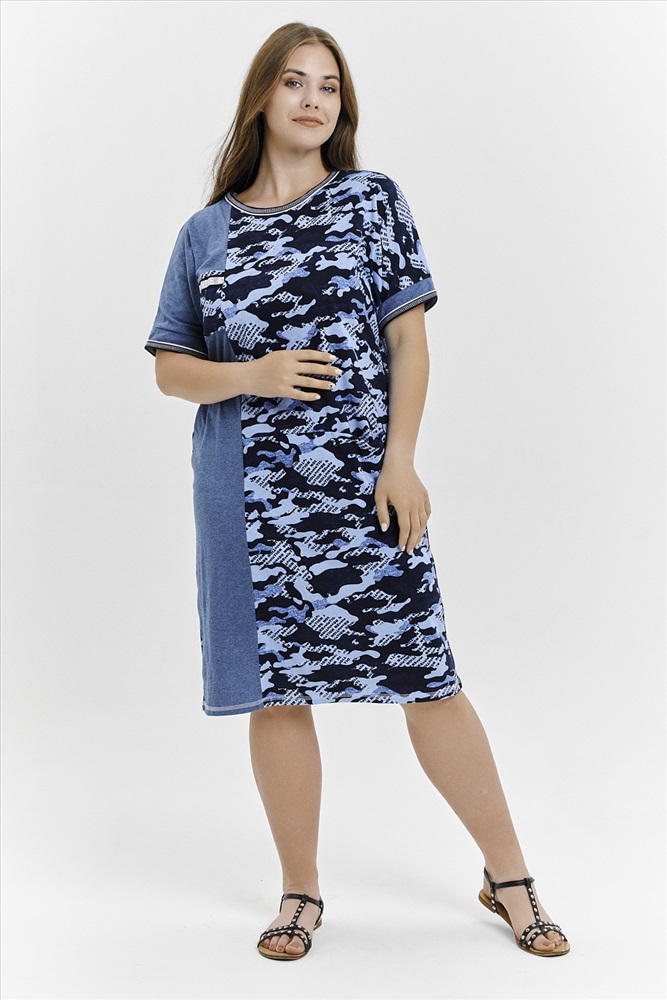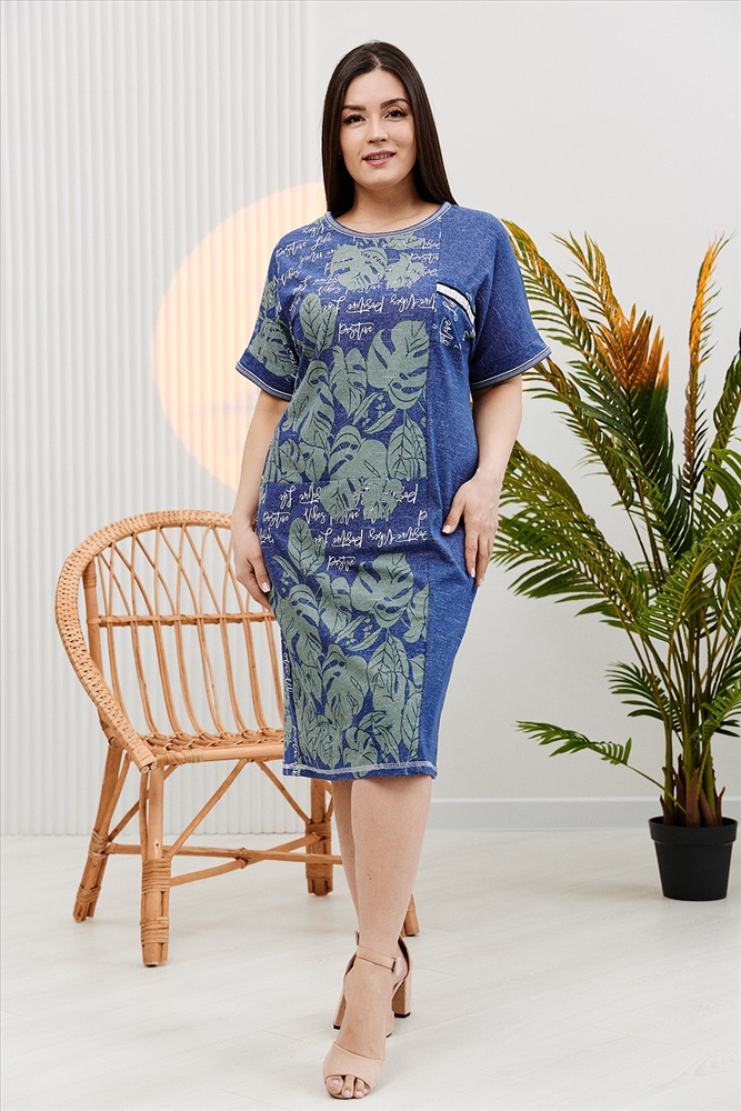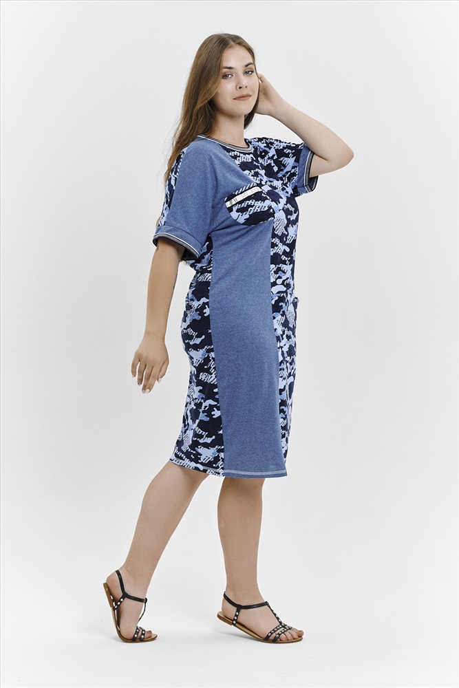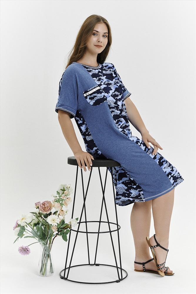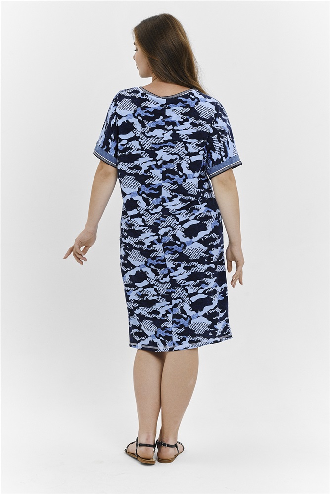 Стиль: повседневный Платье женское полуприлегающего силуэта, рукав цельнокроенный короткий. Полочка состоит из трех частей. Левая боковая часть из контрастной отделочной ткани, сверху расположен нагрудный карман с настроченной на него тесьмой. С правой стороны полочки в горизонтальном шве внутренний карман. Круглый вырез горловины и манжеты рукава окантованы бейкой из отделочной ткани и белым кантом.