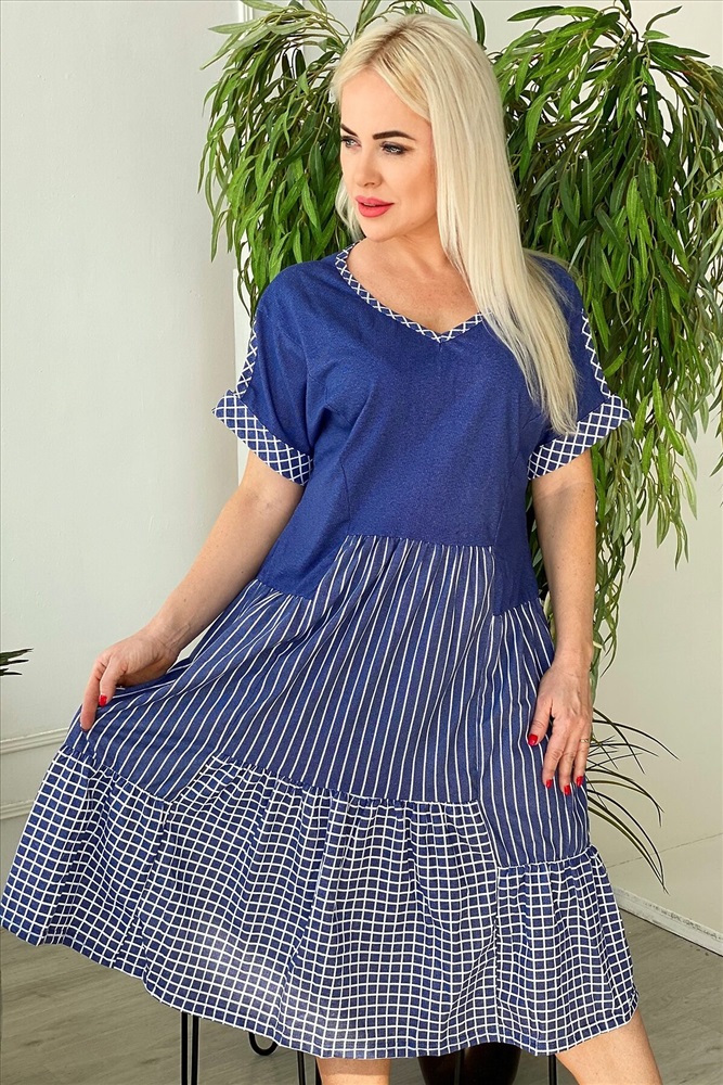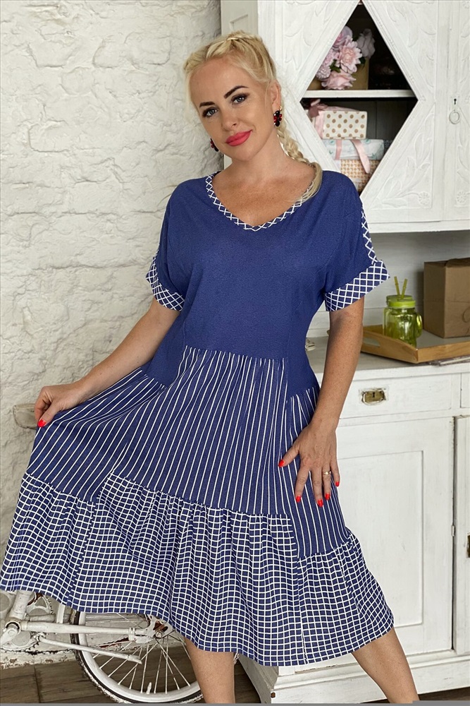 Платье женское полуприлегающего силуэта, к низу расширенное. Рукав цельнокроенный с разрезом, на манжете. Y-образный вырез обработан косой бейкой из ткани в клетку. Низ платья из двух ярусов, расположенных на разных уровнях. Средний ярус из ткани в полоску, нижний - в клетку.