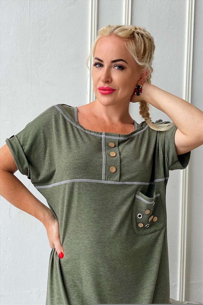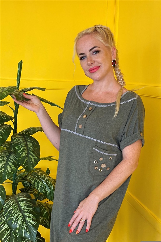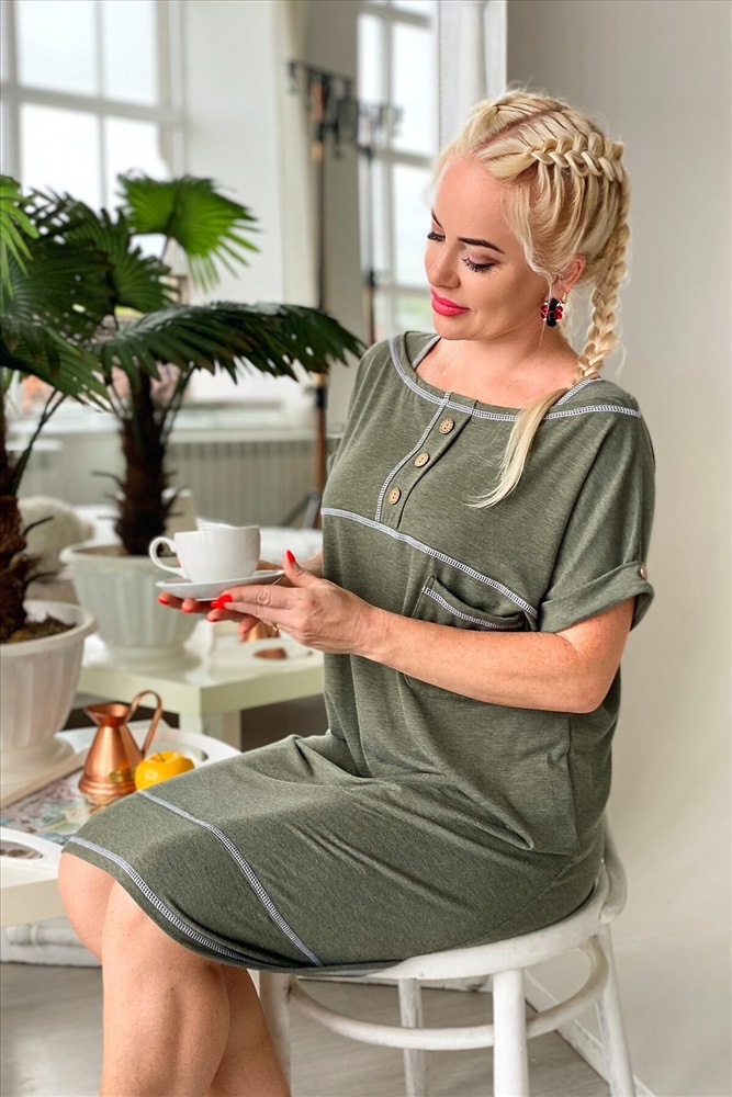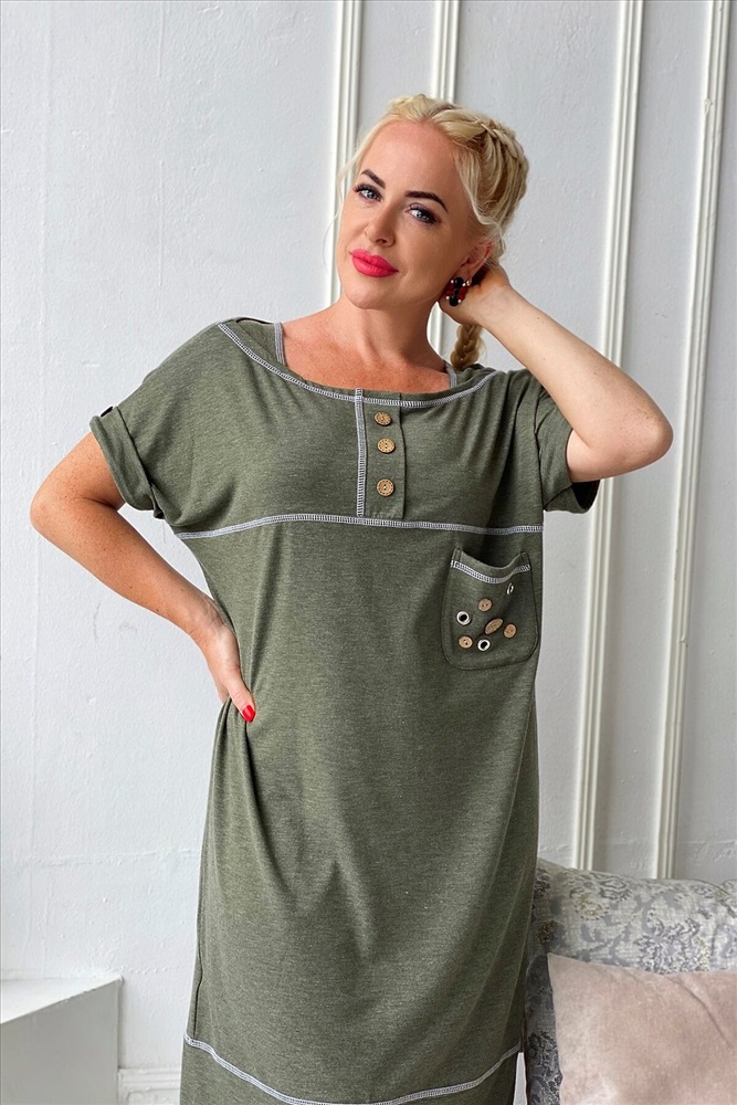 Платье женское прямого силуэта. На полочке и спинке кокетки. Рукав цельнокроенный с притачной манжетой на пуговице. На кокетке полочки планка с тремя декоративными пуговицами. На полочке нагрудный карман с тремя люверсами и четырьмя пуговицами. Шов притачивания нижней части платья, швы притачивания кокеток, планки и горловина отделаны контрастной декоративной строчкой. На нижней части спинки шлица на двух пуговицах.