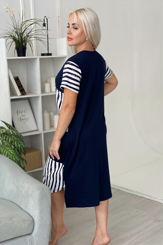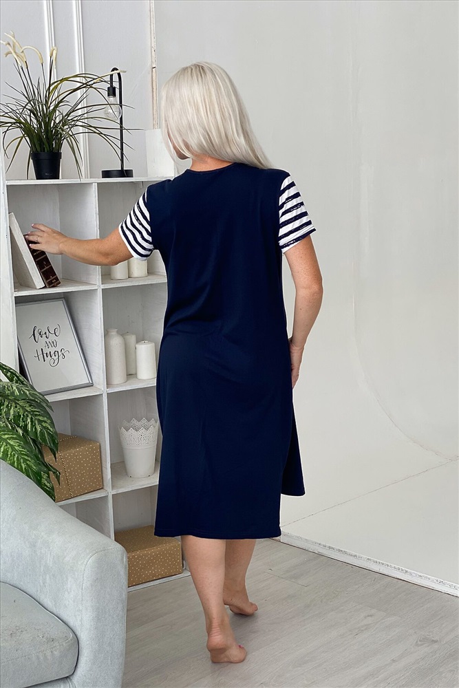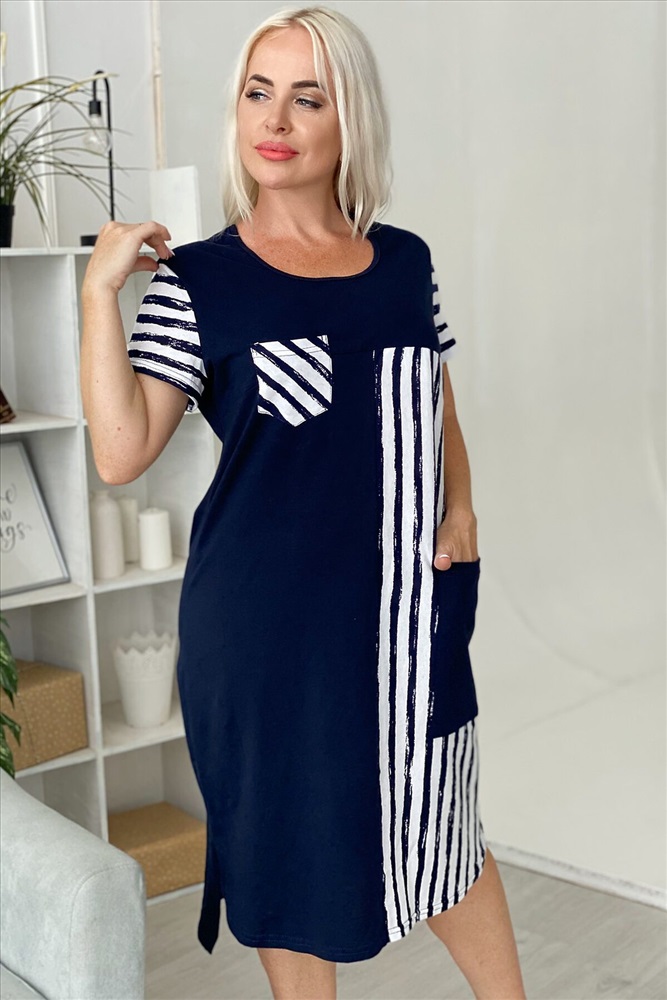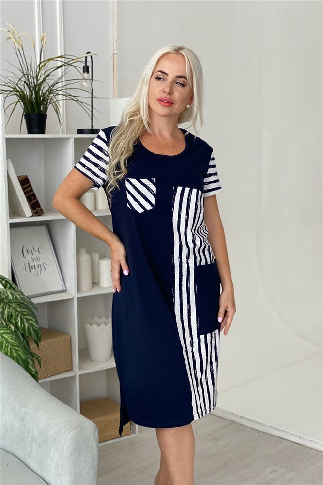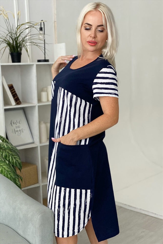ID товара: 778385 Состав: Хлопок 100% Сезон: Весна/Лето Длина: прикрывает колено Фасон: Полуприлегающий Рукав: Короткий Вид застежки: Без застежки Вырез горловины: Округлый Рисунок: Полоски Тип карманов: накладной Декоративные элементы: Разрезы Основная ткань: 100% хлопок | Кулирка Стиль: Повседневный Страна бренда: Россия Страна производства: Россия Платье женское полуприлегающего силуэта. Асимметричный стиль, два накладных кармана, спинка удлиненная. Комментарии к товару