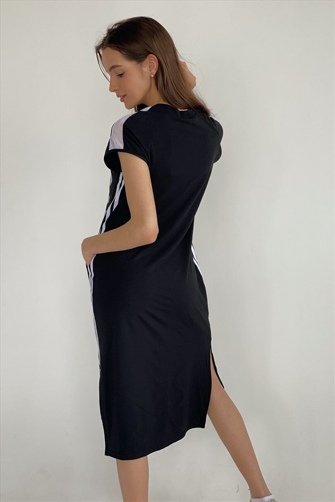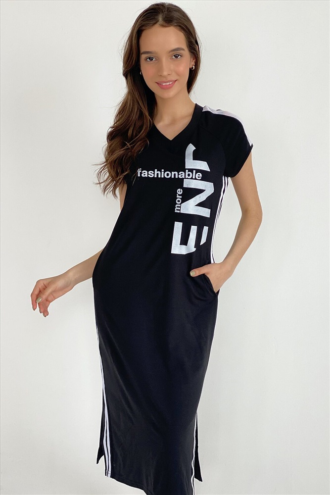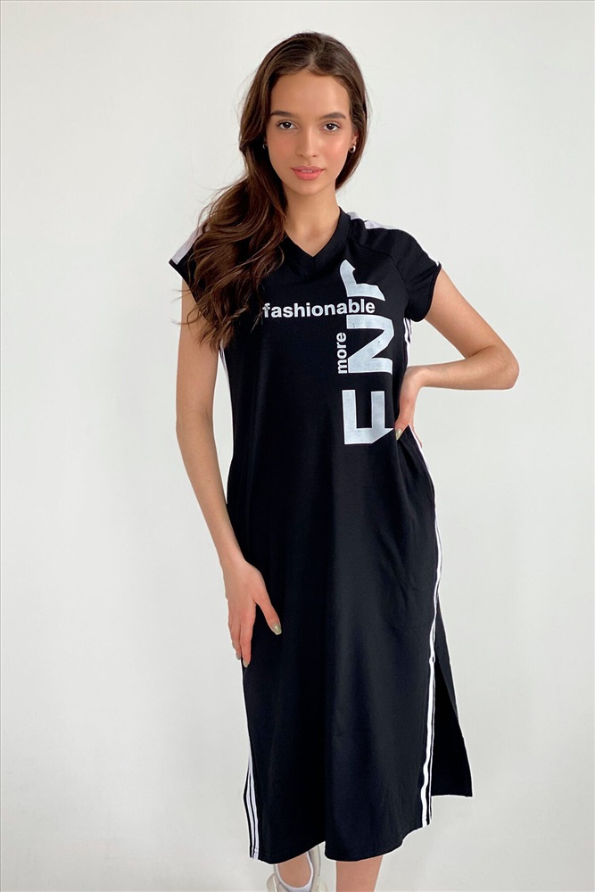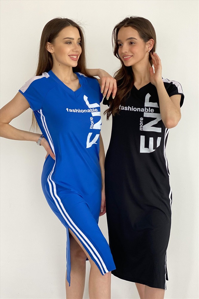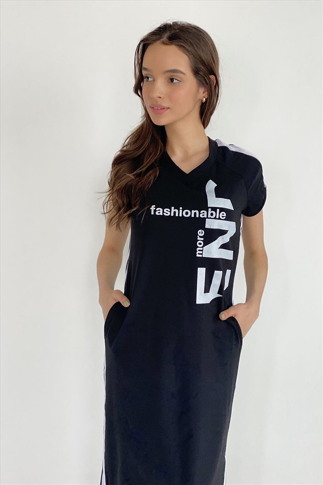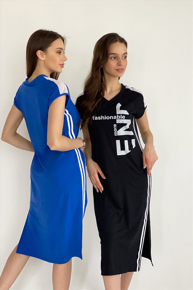 ID товара: 657396 Состав: Вискоза 50%, Полиэстер 45%, Лайкра 5% Сезон: Весна/Лето Длина: Миди Фасон: Прямой Рукав: Короткий Вырез горловины: V-образный Рисунок: Надпись Основная ткань: Вискоза | Вискоза "лайт" Стиль: Спортивный Страна бренда: Россия Страна производства: Россия Платье полуприлегающего силуэта, длинное, с V-образной горловиной, с боковыми карманами. Рукав реглан, короткий, со вставкой из сетки. Полочка с лампасами контрастного цвета вдоль боковых швов. В нижней части боковых швов обработаны разрезы. Горловина обработана обтачкой, рукава обработаны бейкой из основного полотна. Комментарии к товару