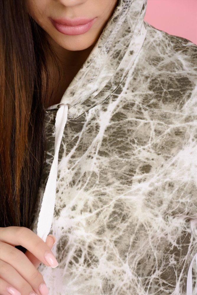 Воротник: с капюшоном Платье прямое, длинное, с капюшоном, с карманом кенгуру. Рукав короткий, с лампасами из отделочного полотна. Полочка с лампасами из отделочного полотна вдоль боковых швов. В нижней части боковых швов обработаны разрезы.