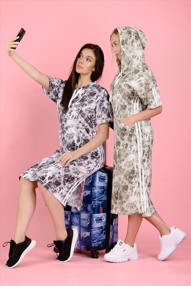 Платье прямое, длинное, с капюшоном, с карманом "кенгуру". Рукав короткий, с лампасами из отделочного полотна. Полочка с лампасами из отделочного полотна вдоль боковых швов. В нижней части боковых швов обработаны разрезы.
