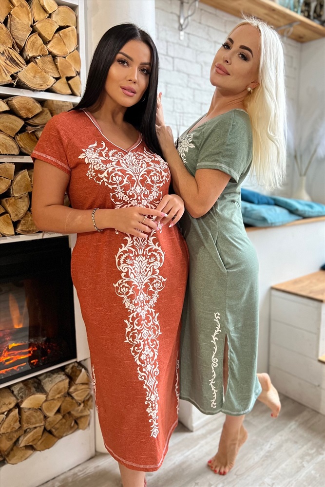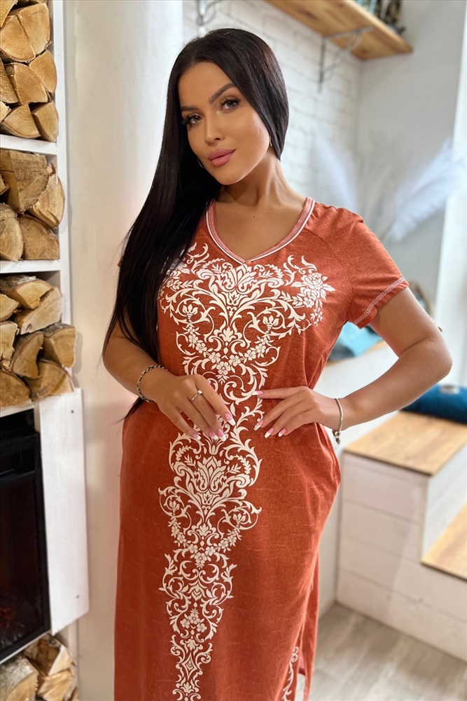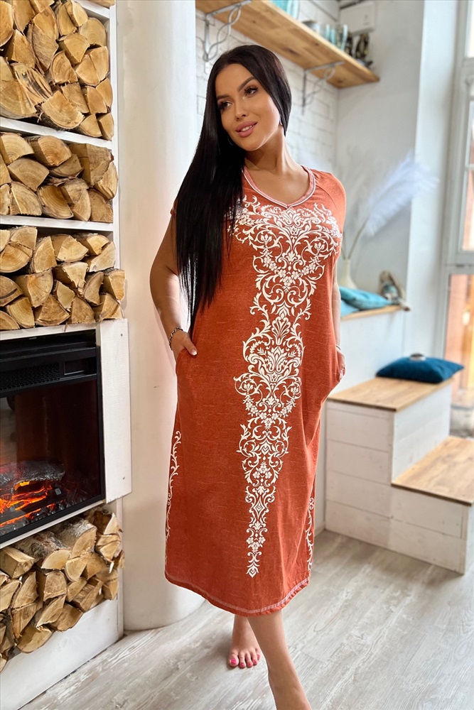 Застежка: без застежки Платье полуприлегающего силуэта, длинное, с V-образной горловиной, с боковыми карманами. Рукав реглан, короткий. В нижней части боковых швов обработаны разрезы. Горловина обработана бейкой из основного полотна с отделочным кантом.