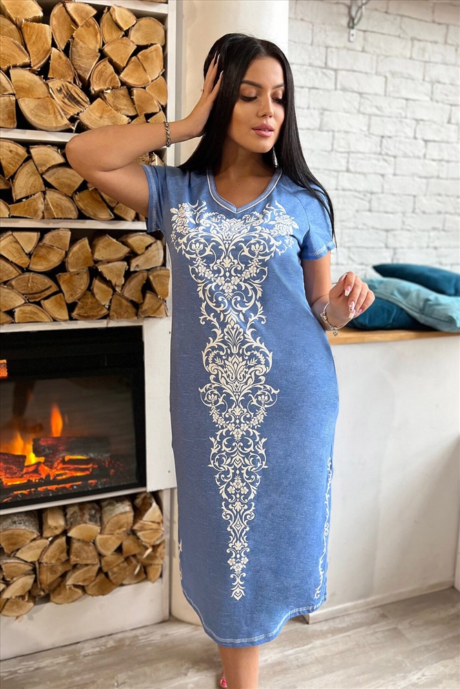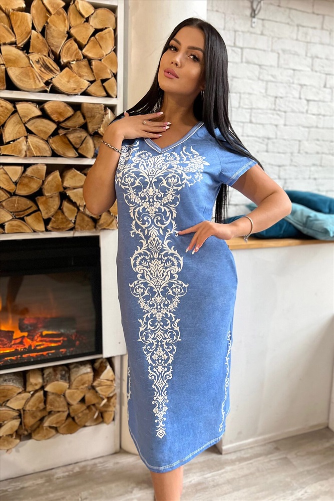 ID товара: 744999 Состав: Хлопок 100% Сезон: Демисезон Длина: Миди Фасон: Полуприлегающий Рукав: Короткие Вид застежки: Без застежки Декоративные элементы: Принт Основная ткань: Хлопок | Кулирка Стиль: Повседневный Страна бренда: Россия Страна производства: Россия Платье полуприлегающего силуэта, длинное, с V-образной горловиной, с боковыми карманами. Рукав реглан, короткий. В нижней части боковых швов обработаны разрезы. Горловина обработана бейкой из основного полотна с отделочным кантом. Комментарии к товару