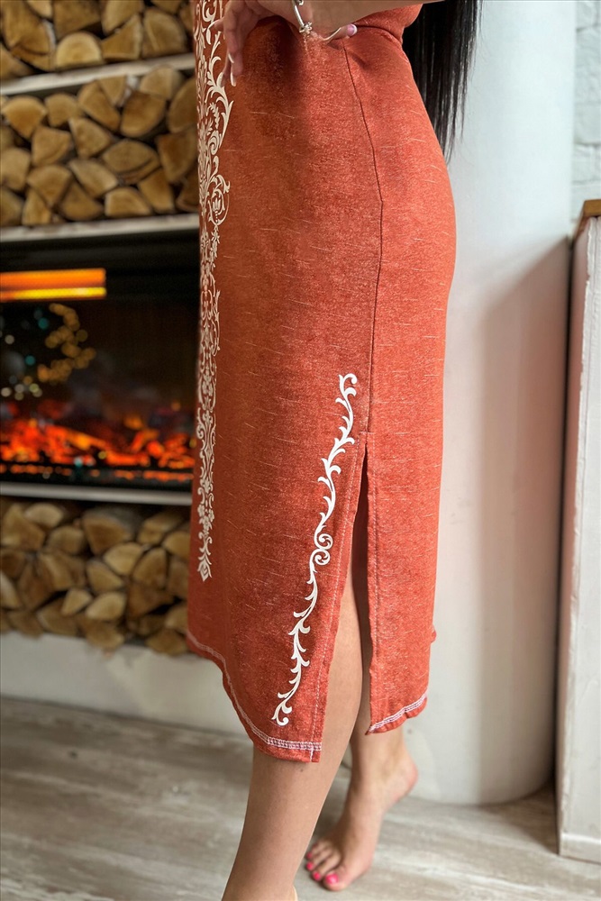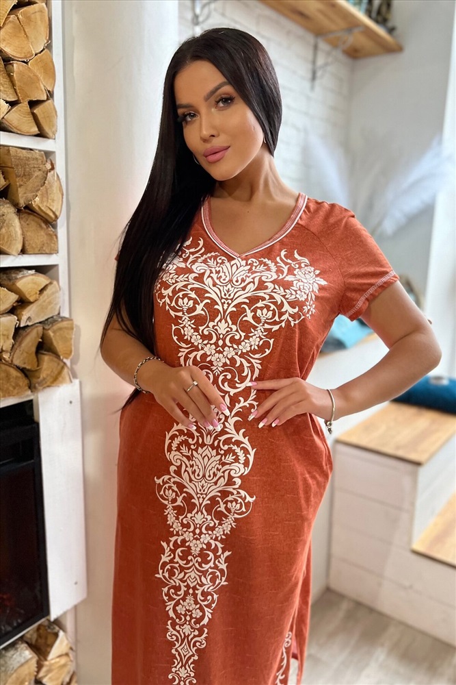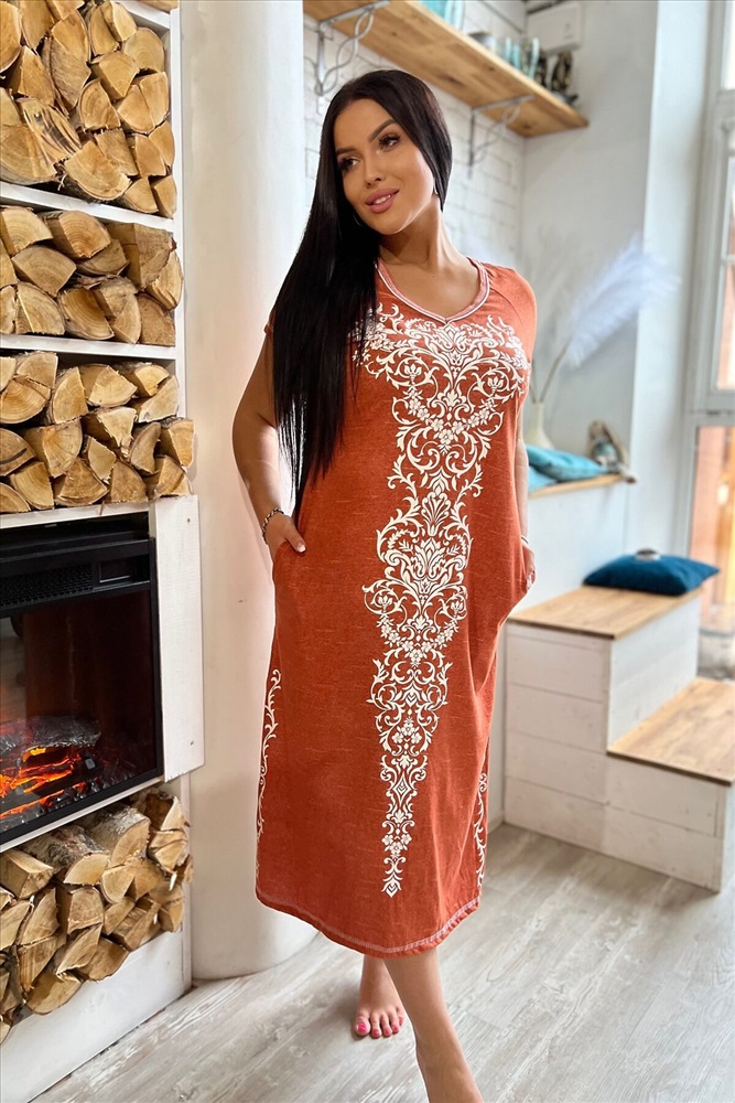 Платье полуприлегающего силуэта, длинное, с V-образной горловиной, с боковыми карманами. Рукав реглан, короткий. В нижней части боковых швов обработаны разрезы. Горловина обработана бейкой из основного полотна с отделочным кантом.