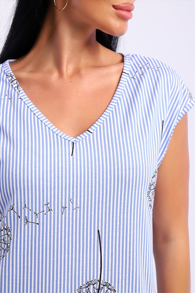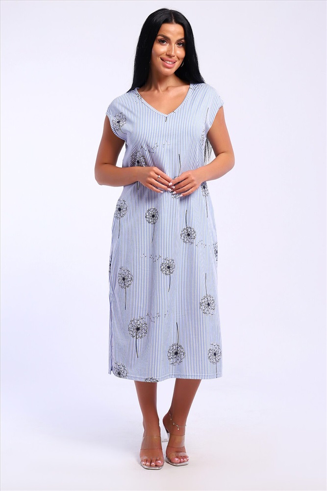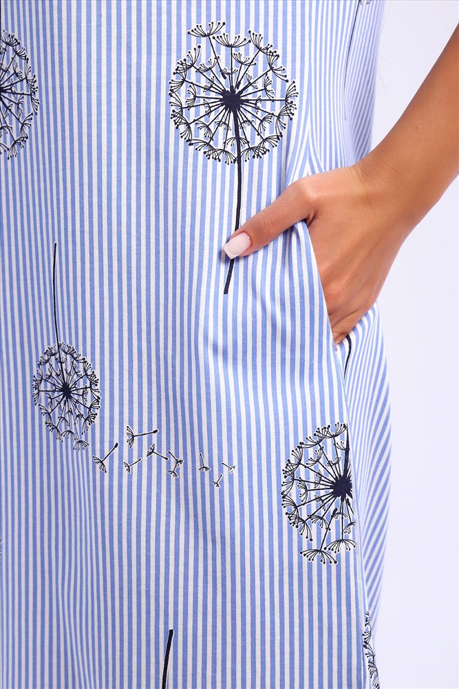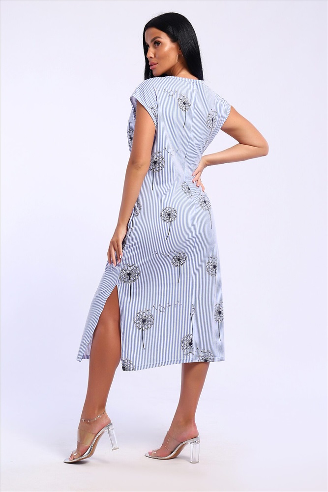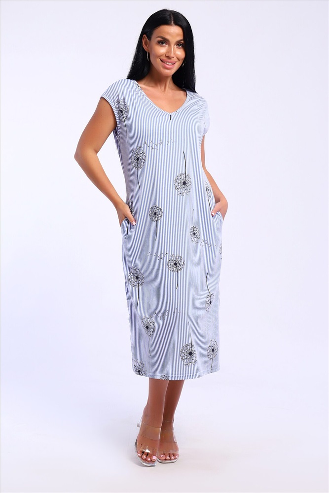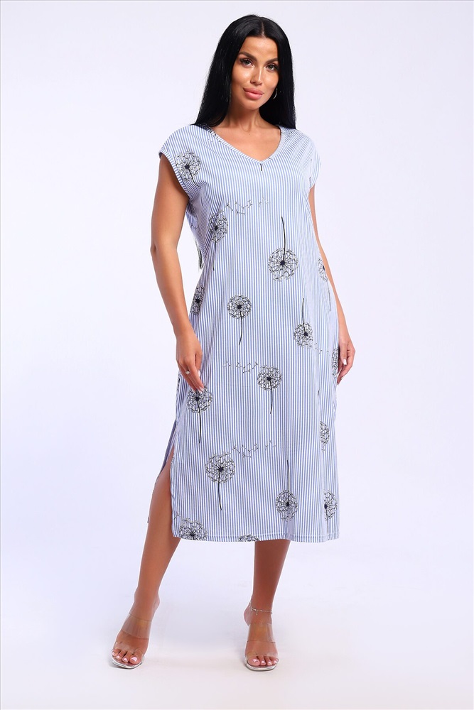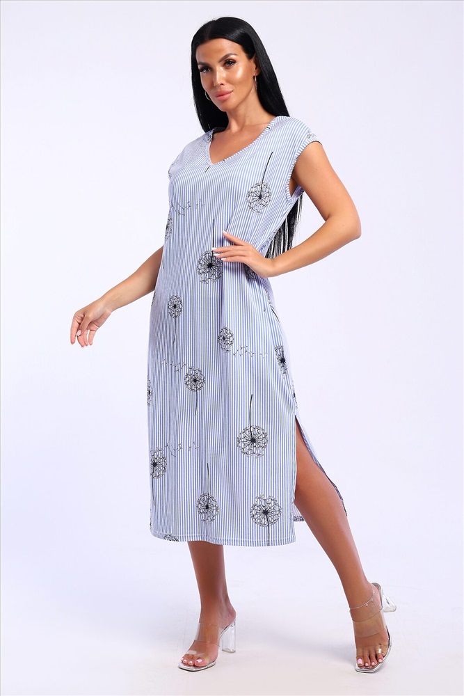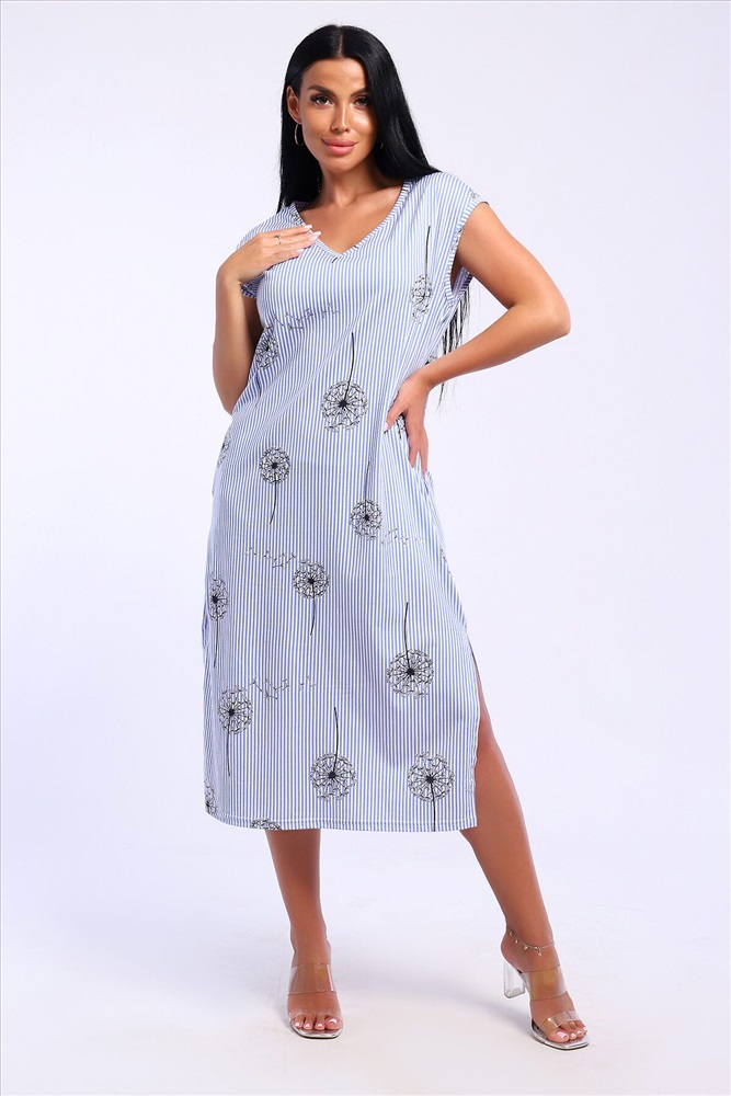 Платье женское из гипоаллергенного, хлопкового, высокого качества компакт пенье трикотажа. Модель слегка приталенного силуэта, фигурный V- образный вырез горловины, безрукавное, в боковых швах удобные карманы, внизу по бокам высокие разрезы. Принт в виде тонкой продольной полоски с изображением легкого, изящного соцветия одуванчика придаст стройности и женственности вашему образу. Летнее миди-платье комфортное, стильное, универсальное подходит для повседневных мероприятий, деловых встреч, а так же вечерних прогулок.
