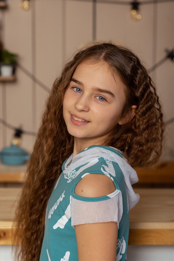 Платье длинной выше колена, с оборкой по низу, с капюшоном из сетки. Рукав короткий из сетки, с фигурным вырезом. Лицевой край капюшона, фигурные вырезы рукавов обработаны бейкой из основного полотна.