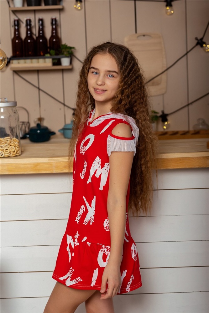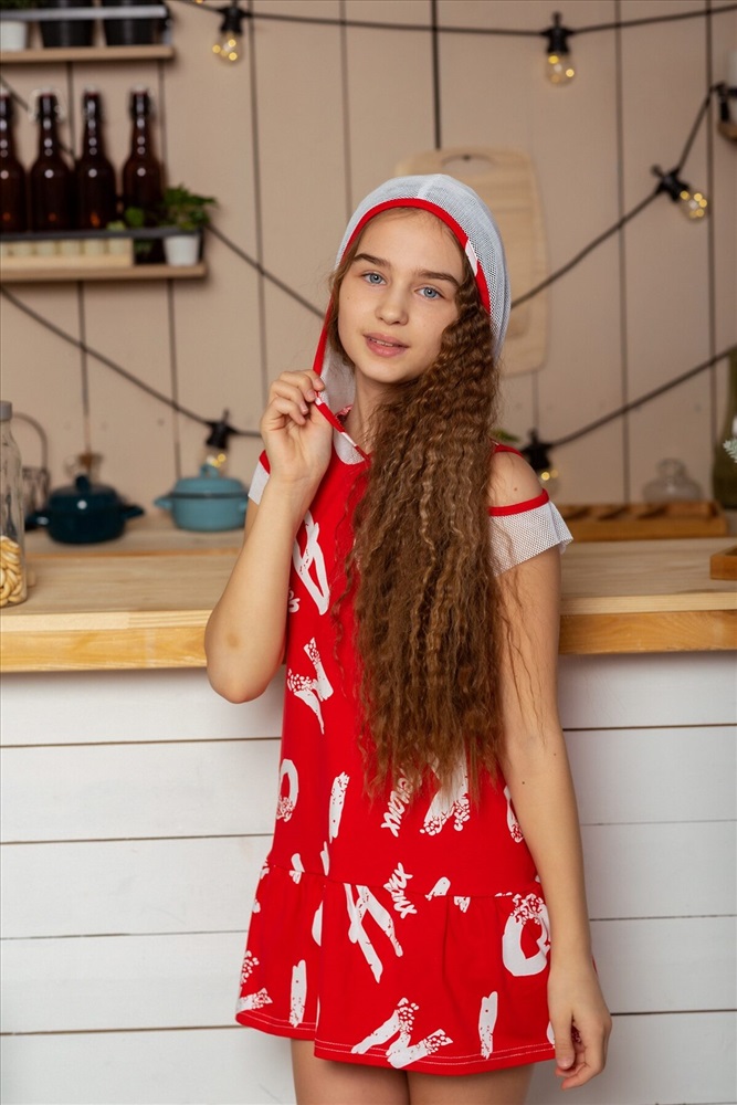 Платье длинной выше колена, с оборкой по низу, с капюшоном из сетки. Рукав короткий из сетки, с фигурным вырезом. Лицевой край капюшона, фигурные вырезы рукавов обработаны бейкой из основного полотна.