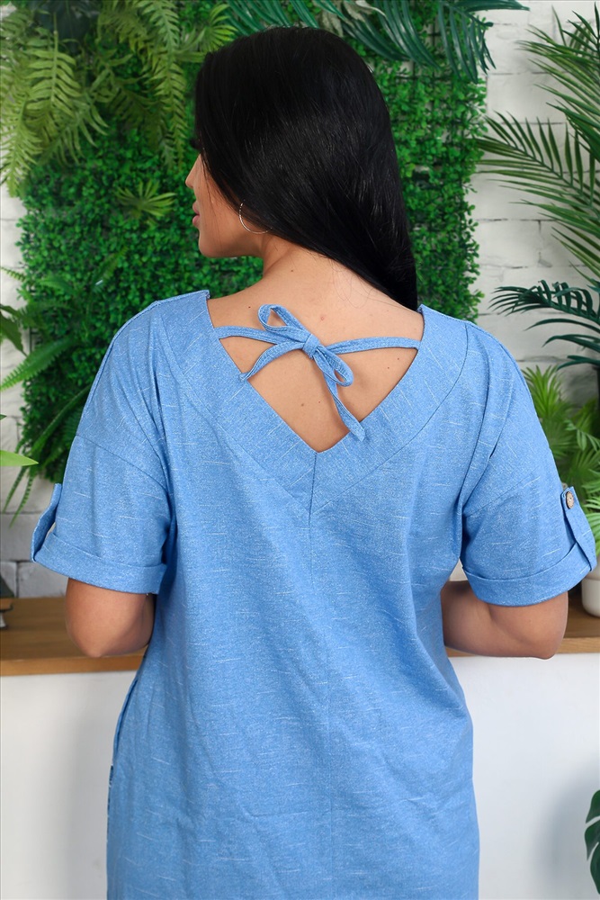 Платье прямого силуэта, с V-образной горловиной спереди и сзади, с карманами, с разрезами в нижней части боковых швов. Рукав короткий, с отложным манжетом и хлястом с пуговицей. Вход в карман обработан бейкой из основного полотна.